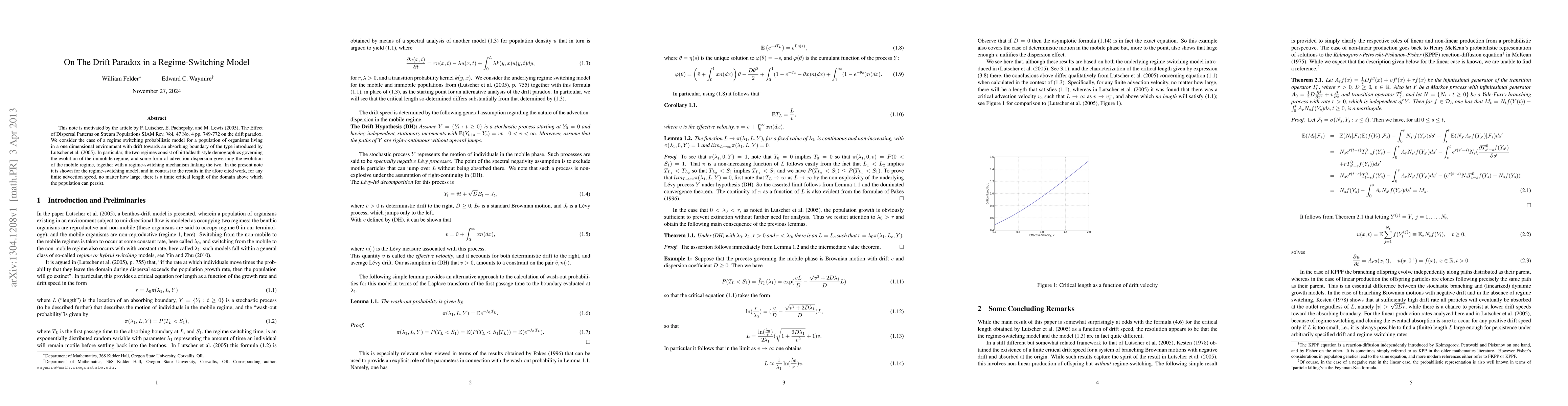 This note is motivated by the article by F. Lutscher, E. Pachepsky, and M. Lewis (2005), The Effect of Dispersal Patterns on Stream Populations SIAM Rev. Vol. 47 No. 4 pp. 749-772 on the drift paradox. We consider the case of a regime switching probabilistic model for a population of organisms living in a one dimensional environment with drift towards an absorbing boundary of the type introduced by Lutscher et al. (2005). In particular, the two regimes consist of birth/death style demographics governing the evolution of the immobile regime, and some form of advection-dispersion governing the evolution of the mobile regime, together with a regime-switching mechanism linking the two. In the present note it is shown for the regime-switching model, and in contrast to the results in the afore cited work, for any finite advection speed, no matter how large, there is a finite critical length of the domain above which the population can persist.