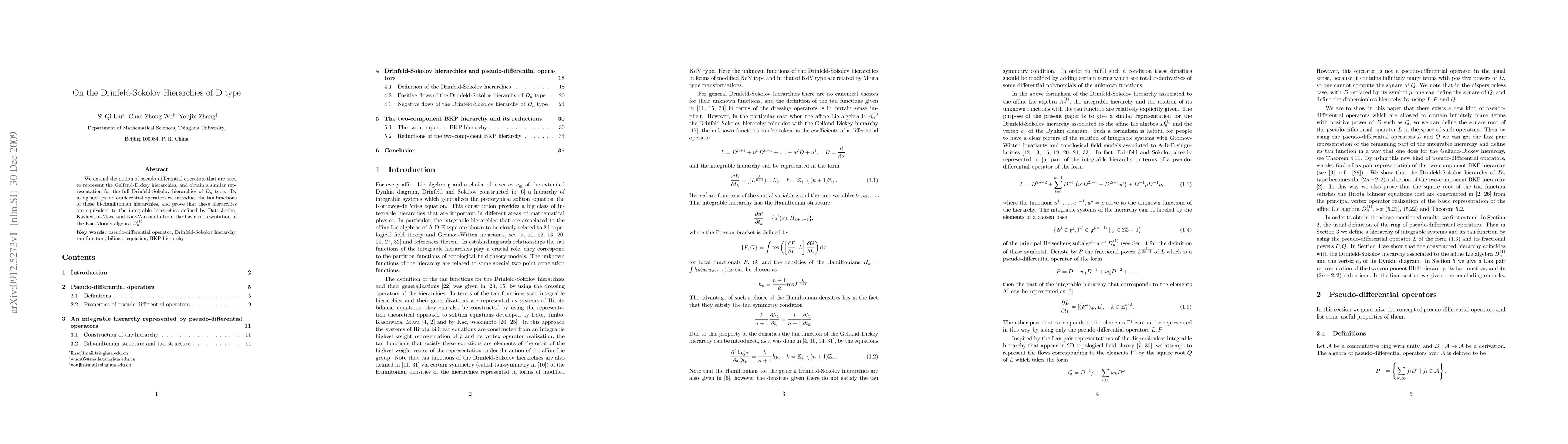 This paper extends pseudo-differential operators to represent Drinfeld-Sokolov hierarchies of $D_n$ type, introducing tau functions and proving their equivalence to integrable hierarchies from Kac-Moody algebra $D_n^{(1)}$.