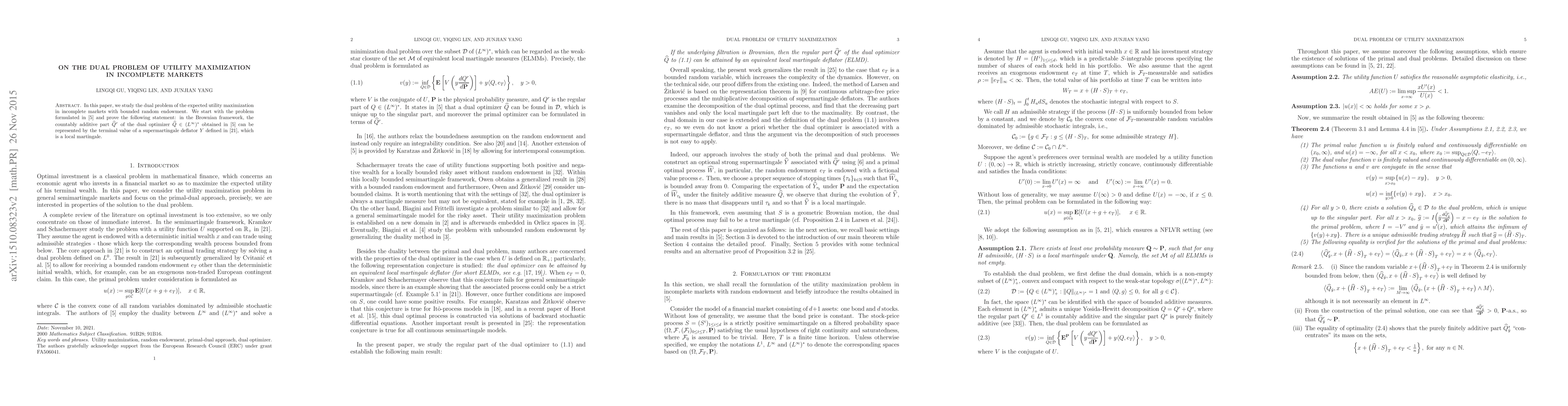 This paper investigates the dual problem of expected utility maximization in incomplete markets, proving that the countably additive part of the dual optimizer can be represented by the terminal value of a supermartingale deflator, a local martingale, as established in the work of Kramkov-Schachermayer.
