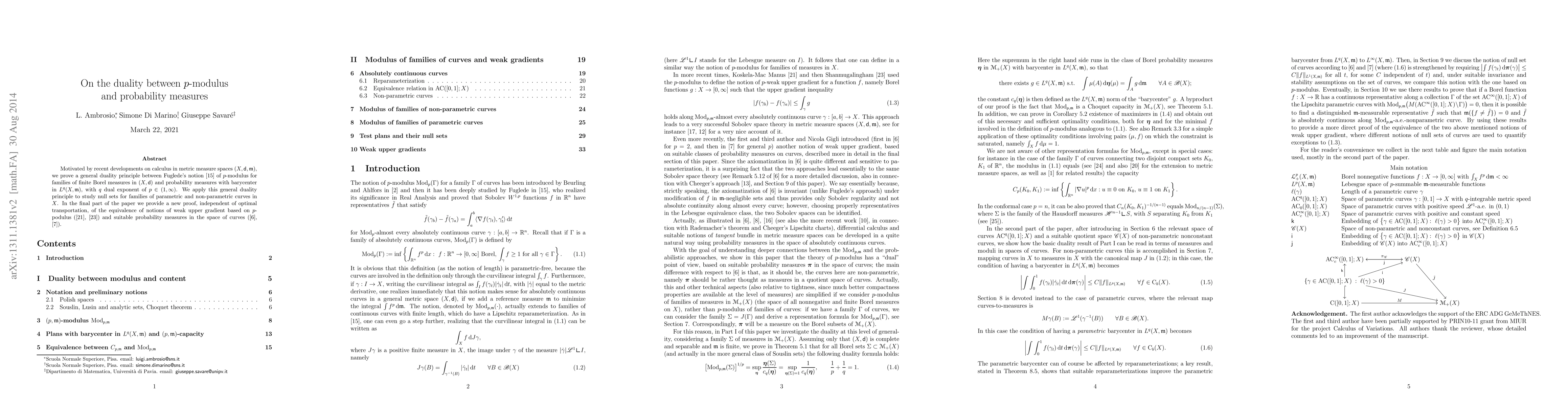 A research paper establishes a duality principle between p-Modulus and probability measures in metric measure spaces, allowing for the study of null sets for families of curves and proving the equivalence of weak upper gradient concepts.