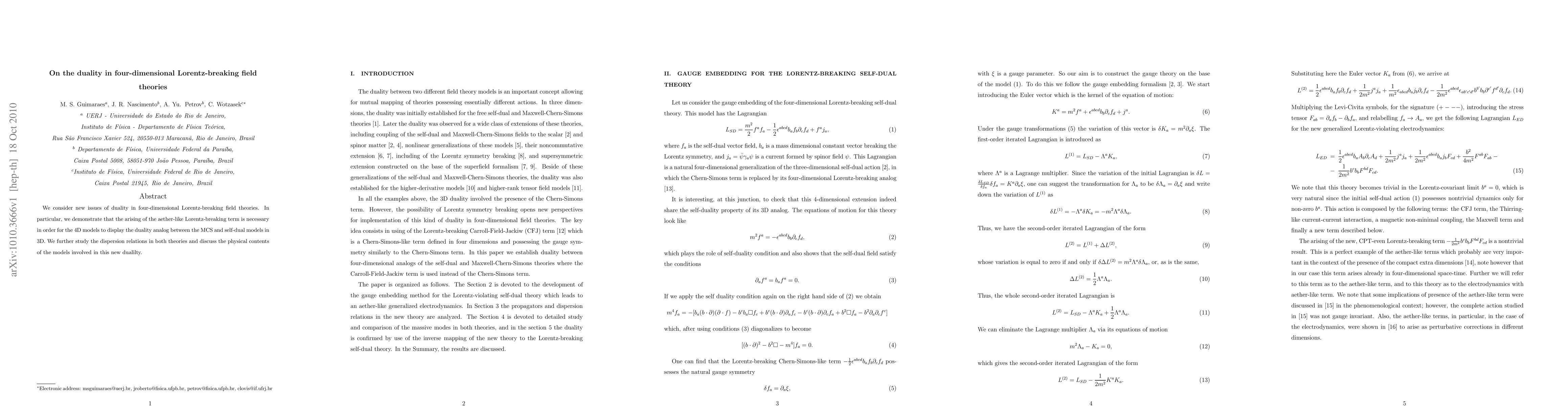 This paper explores the duality in four-dimensional Lorentz-breaking field theories, showing that aether-like terms are essential for the duality analog between MCS and self-dual models in 3D. It also examines the dispersion relations and discusses the physical implications of this new duality.
