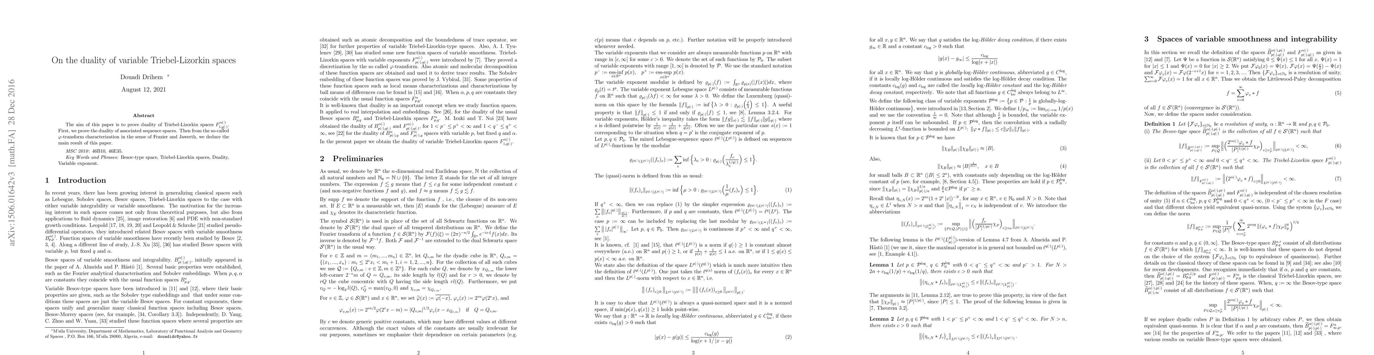 This paper proves the duality of Triebel-Lizorkin spaces $F_{1,q\left( \cdot \right) }^{\alpha \left( \cdot \right) }$ by first establishing the duality of associated sequence spaces and then using the $\varphi$-transform characterization.