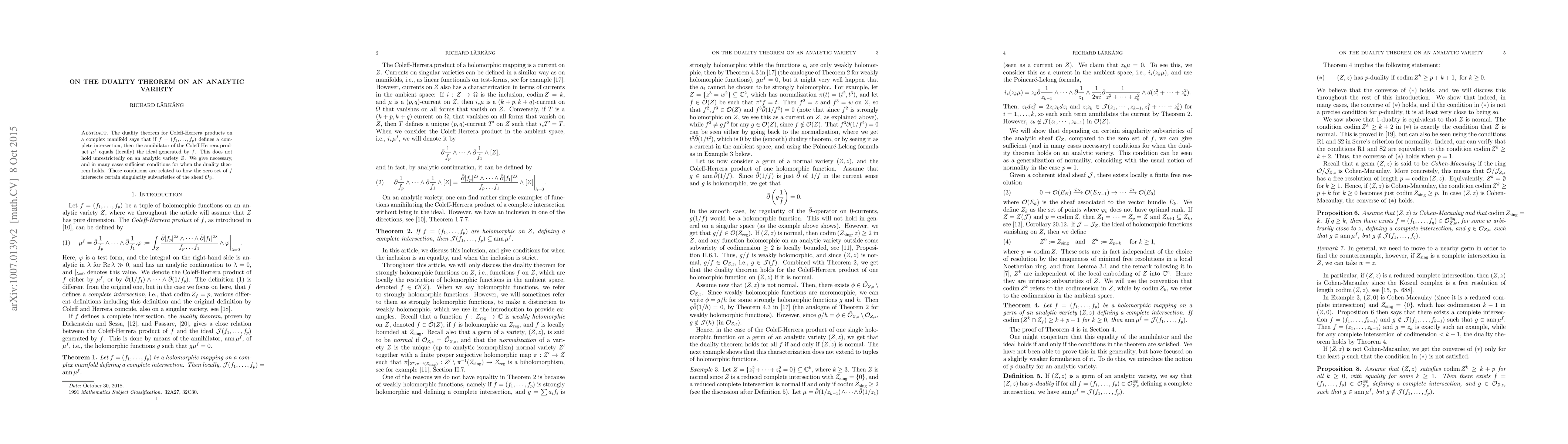 The duality theorem for Coleff-Herrera products on a complex manifold says that if $f = (f_1,\dots,f_p)$ defines a complete intersection, then the annihilator of the Coleff-Herrera product $\mu^f$ equals (locally) the ideal generated by $f$. This does not hold unrestrictedly on an analytic variety $Z$. We give necessary, and in many cases sufficient conditions for when the duality theorem holds. These conditions are related to how the zero set of $f$ intersects certain singularity subvarieties of the sheaf $\mathcal{O}_Z$.