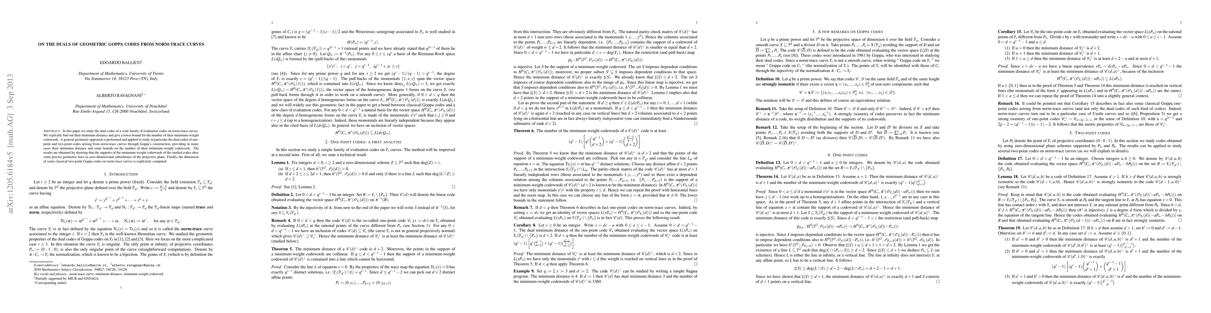 This paper investigates the duals of geometric Goppa codes derived from norm-trace curves, determining their minimum distance and providing bounds on the number of minimum-weight codewords. It employs a geometric approach to analyze the duals of one-point and two-point codes, revealing their structural properties through the geometric laws governing their codeword supports.