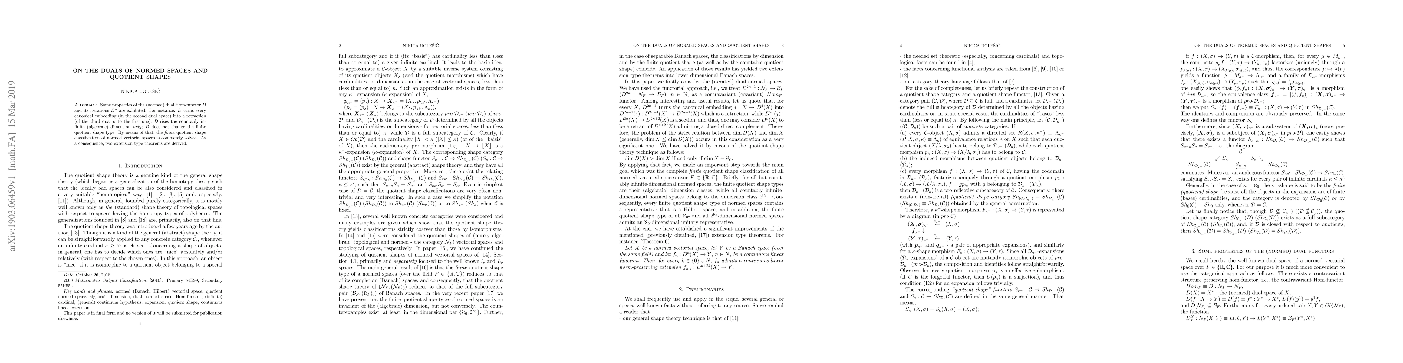 This paper explores properties of the normed dual Hom-functor $D$ and its iterations $D^n$, showing that $D$ transforms canonical embeddings into retractions and preserves finite quotient shape types. It concludes with the complete classification of normed vectorial spaces based on finite quotient shapes and derives two extension theorems.