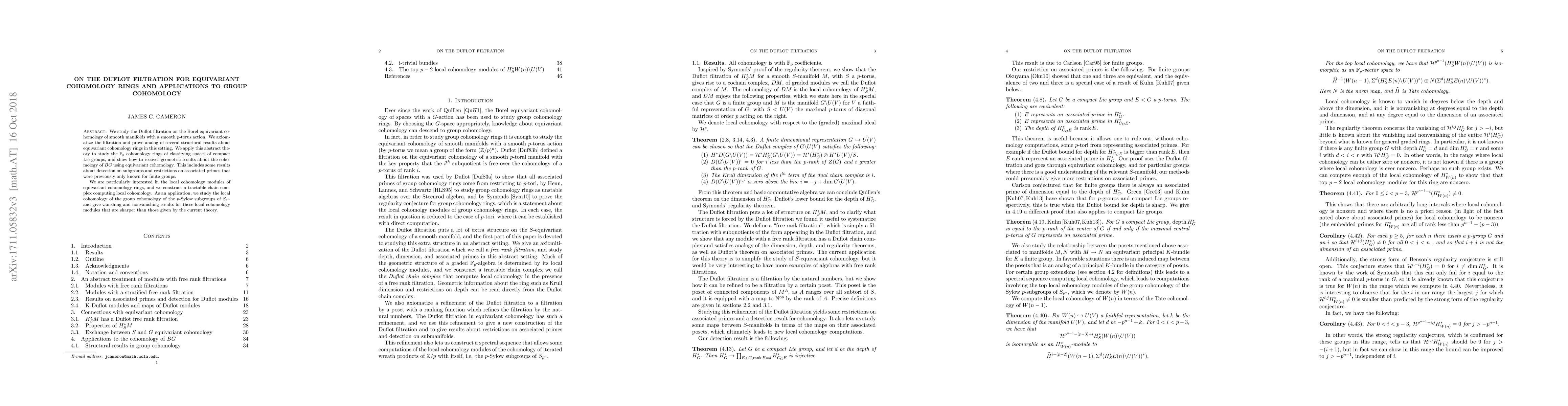This paper investigates the Duflot filtration in Borel equivariant cohomology of smooth manifolds under $p$-torus actions, establishing structural results and applications to group cohomology, particularly focusing on $\mathbb{F}_p$ cohomology of classifying spaces. It also presents new local cohomology results for the group cohomology of $p$-Sylow subgroups of symmetric groups.
