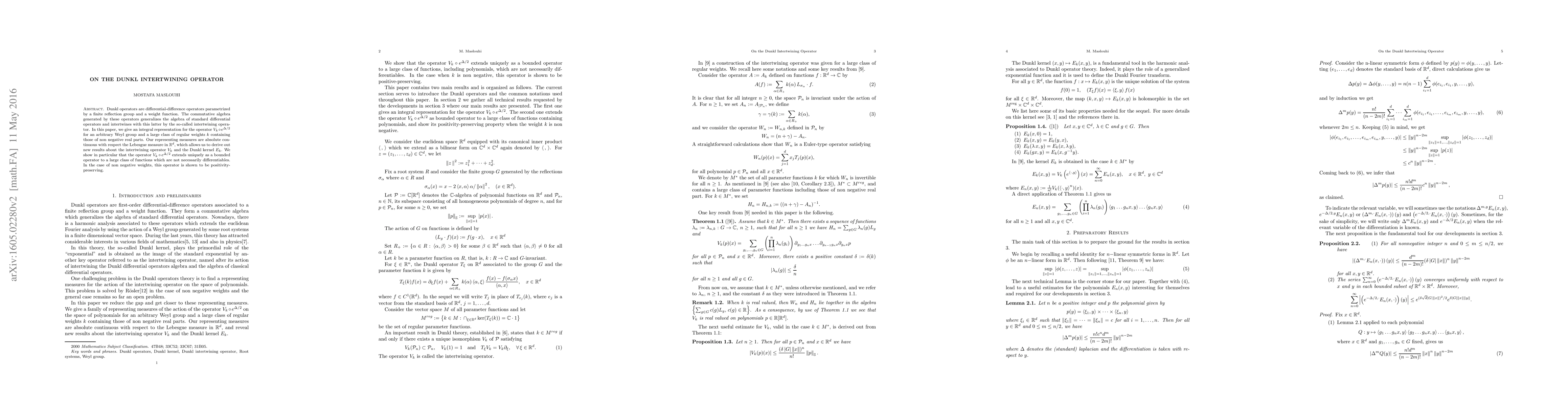 Dunkl operators are differential-difference operators parametrized by a finite reflection group and a weight function. The commutative algebra generated by these operators generalizes the algebra of standard differential operators and intertwines with this latter by the so-called intertwining operator. In this paper, we give an integral representation for the operator $V_k\circ e^{\Delta/2}$ for an arbitrary Weyl group and a large class of regular weights $k$ containing those of non negative real parts. Our representing measures are absolute continuous with respect the Lebesgue measure in $\Rd$, which allows us to derive out new results about the intertwining operator $V_k$ and the Dunkl kernel $E_k$. We show in particular that the operator $V_k\circ e^{\Delta/2}$ extends uniquely as a bounded operator to a large class of functions which are not necessarily differentiables. In the case of non negative weights, this operator is shown to be positivity-preserving.