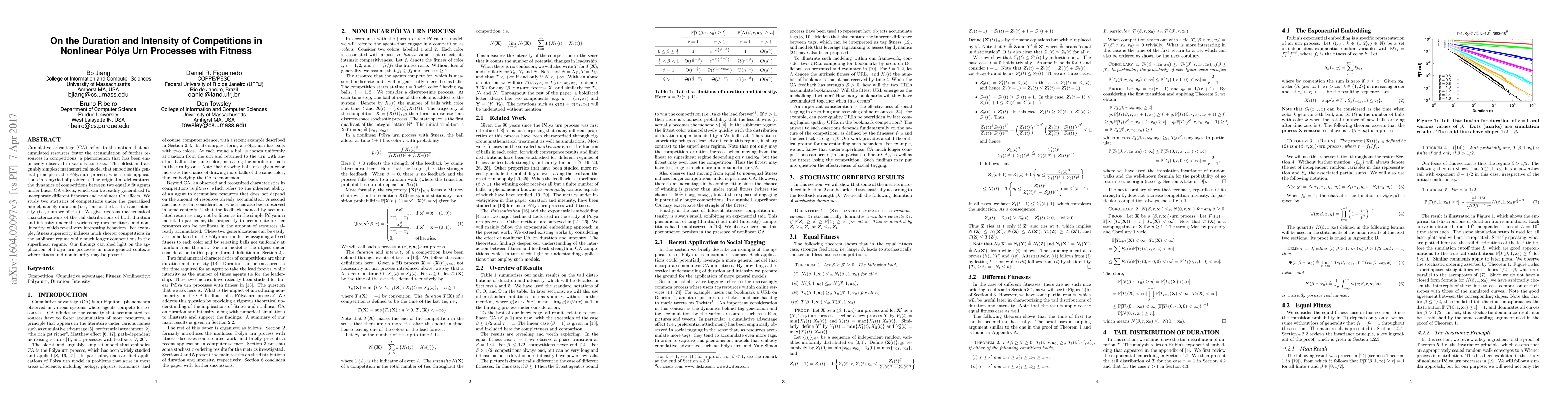 Cumulative advantage (CA) refers to the notion that accumulated resources foster the accumulation of further resources in competitions, a phenomenon that has been empirically observed in various contexts. The oldest and arguably simplest mathematical model that embodies this general principle is the P\'olya urn process, which finds applications in a myriad of problems. The original model captures the dynamics of competitions between two equally fit agents under linear CA effects, which can be readily generalized to incorporate different fitnesses and nonlinear CA effects. We study two statistics of competitions under the generalized model, namely duration (i.e., time of the last tie) and intensity (i.e., number of ties). We give rigorous mathematical characterizations of the tail distributions of both duration and intensity under the various regimes for fitness and nonlinearity, which reveal very interesting behaviors. For example, fitness superiority induces much shorter competitions in the sublinear regime while much longer competitions in the superlinear regime. Our findings can shed light on the application of P\'olya urn processes in more general contexts where fitness and nonlinearity may be present.