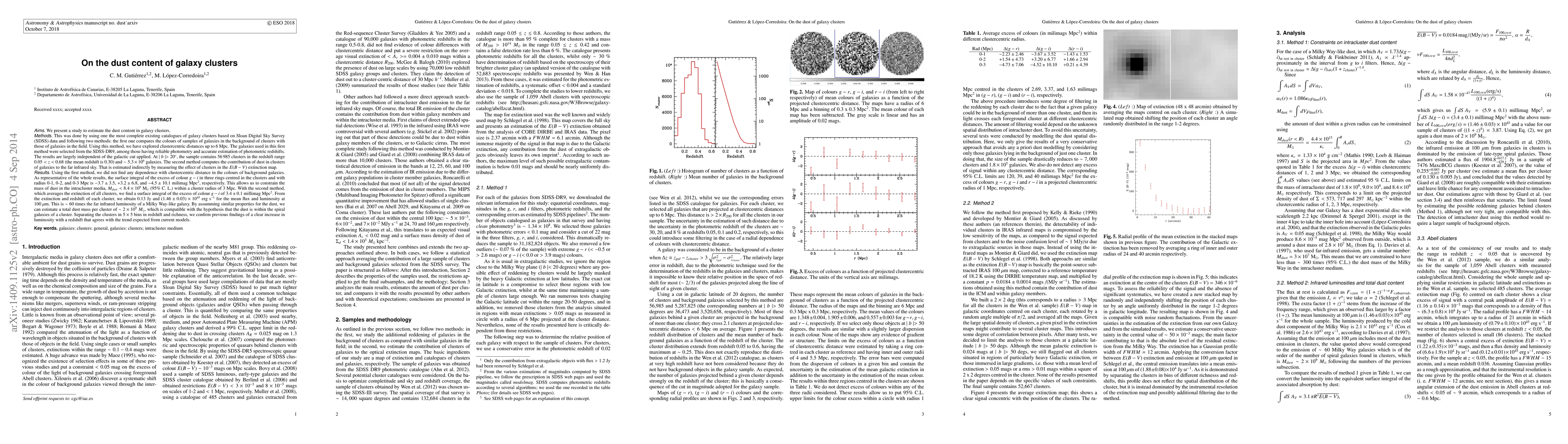 This study estimates the dust content in galaxy clusters using the SDSS-DR9 catalogue and two methods: comparing galaxy colors in clusters versus the field and measuring dust contribution via infrared sky effects. The results suggest a dust mass within 3 Mpc of clusters less than 8.4x10^9 M_sun and a total dust mass per cluster of ~2x10^9 M_sun, consistent with dust residing in spiral galaxies.