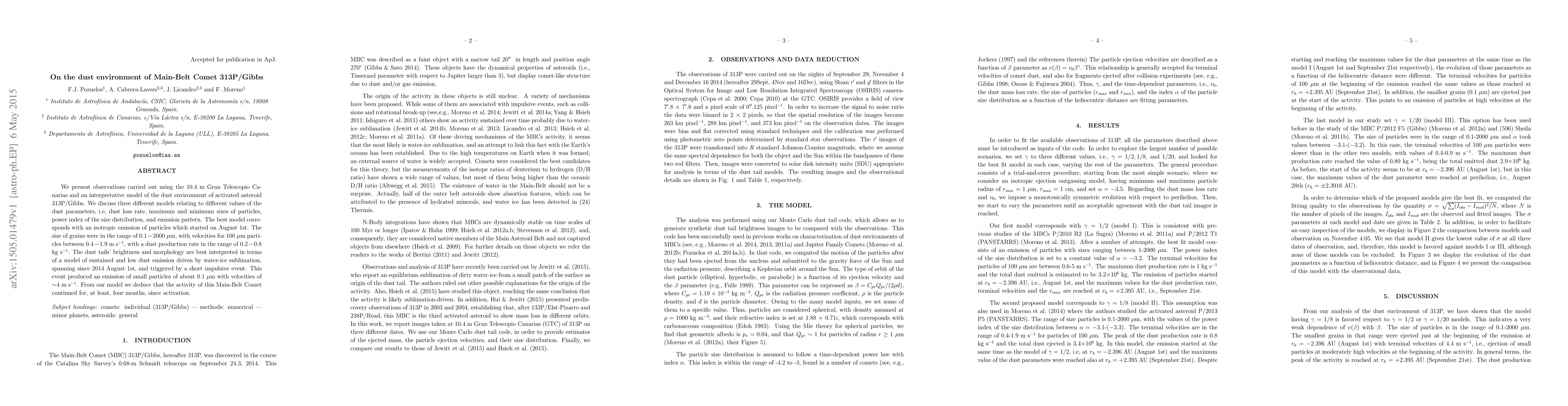 The study observes Main-Belt Comet 313P/Gibbs using the 10.4 m Gran Telescopio Canarias, proposing an isotropic dust emission model starting August 1, 2014. Grains ranged from 0.1 to 2000 µm with velocities 0.4-1.9 m/s sustaining activity for at least four months, driven by water-ice sublimation.
