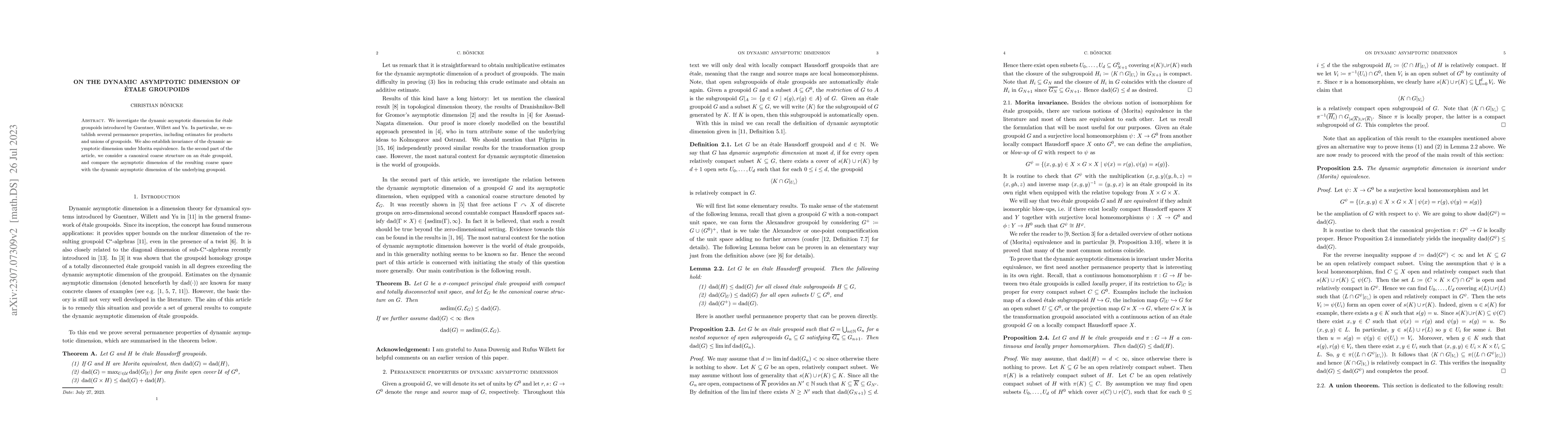 This paper studies the dynamic asymptotic dimension for \'etale groupoids, establishing permanence properties like product and union estimates, and proving invariance under Morita equivalence. It also explores the relationship between the asymptotic dimension of the coarse space derived from an \'etale groupoid and its dynamic asymptotic dimension.