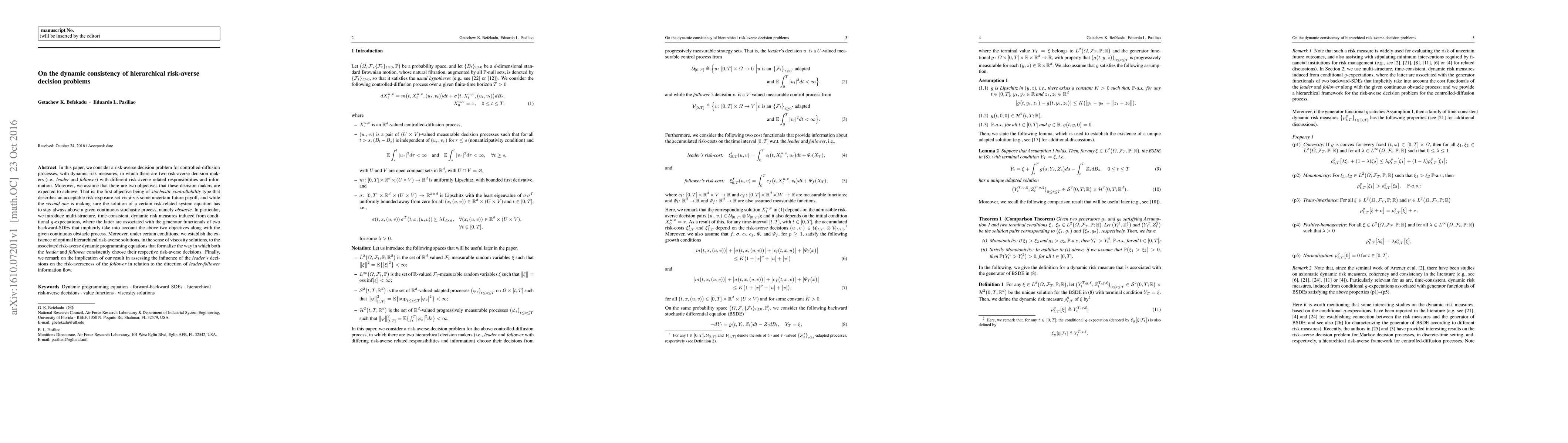 In this paper, we consider a risk-averse decision problem for controlled-diffusion processes, with dynamic risk measures, in which there are two risk-averse decision makers (i.e., {\it leader} and {\it follower}) with different risk-averse related responsibilities and information. Moreover, we assume that there are two objectives that these decision makers are expected to achieve. That is, the first objective being of {\it stochastic controllability} type that describes an acceptable risk-exposure set vis-\'a-vis some uncertain future payoff, and while the {\it second one} is making sure the solution of a certain risk-related system equation has to stay always above a given continuous stochastic process, namely {\it obstacle}. In particular, we introduce multi-structure, time-consistent, dynamic risk measures induced from conditional $g$-expectations, where the latter are associated with the generator functionals of two backward-SDEs that implicitly take into account the above two objectives along with the given continuous obstacle process. Moreover, under certain conditions, we establish the existence of optimal hierarchical risk-averse solutions, in the sense of viscosity solutions, to the associated risk-averse dynamic programming equations that formalize the way in which both the {\it leader} and {\it follower} consistently choose their respective risk-averse decisions. Finally, we remark on the implication of our result in assessing the influence of the {\it leader'}s decisions on the risk-averseness of the {\it follower} in relation to the direction of {\it leader-follower} information flow.