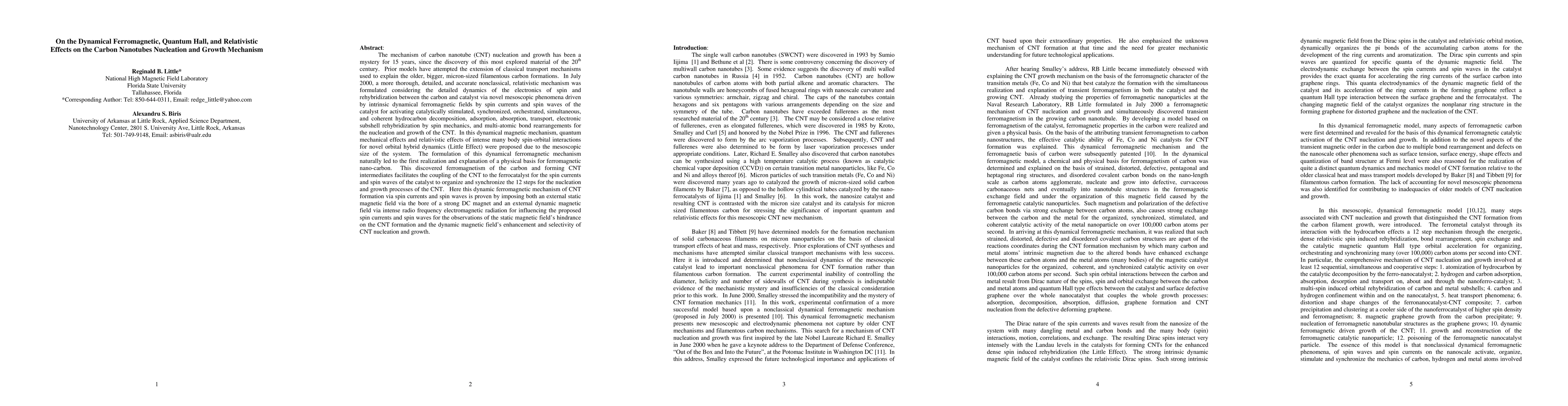 The mechanism of carbon nanotube (CNT) nucleation and growth has been a mystery for over 15 years. Prior models have attempted the extension of older classical transport mechanisms. In July 2000, a more detailed and accurate nonclassical, relativistic mechanism was formulated considering the detailed dynamics of the electronics of spin and orbital rehybridization between the carbon and catalyst via novel mesoscopic phenomena and quantum dynamics. Ferromagnetic carbon was demonstrated. Here, quantum (Hall) effects and relativistic effects of intense many body spin-orbital interactions for novel orbital rehybridization dynamics (Little Effect) are proposed in this new dynamical magnetic mechanism. This dynamic ferromagnetic mechanism is proven by imposing dynamic and static magnetic fields during CNT syntheses and observing the different influence of these external magnetic environments on the catalyzing spin currents and spin waves and the resulting CNT formation.