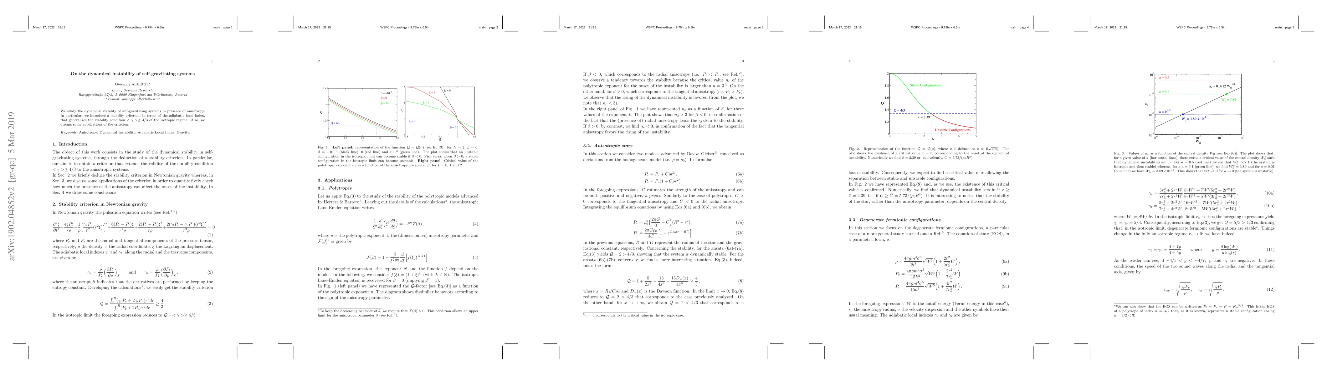 This paper investigates the dynamical stability of self-gravitating systems with anisotropy, introducing a new stability criterion based on the adiabatic local index that extends the isotropic stability condition. The study also explores practical applications of this criterion.