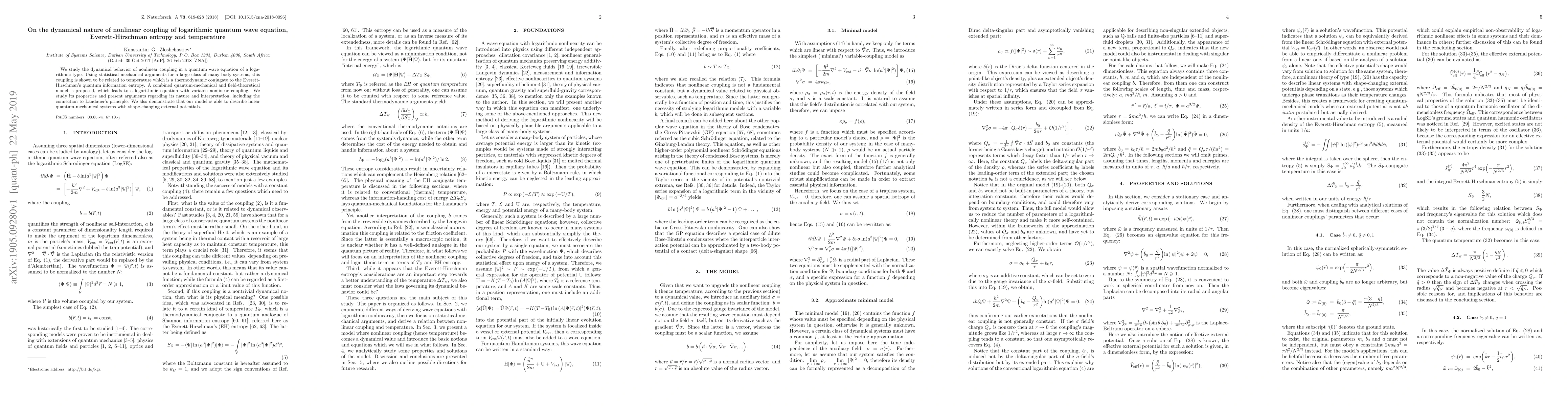 We study the dynamical behavior of nonlinear coupling in a quantum wave equation of a logarithmic type. Using statistical mechanical arguments for a large class of many-body systems, this coupling is shown to be related to temperature which is a thermodynamic conjugate to the Everett-Hirschman's quantum information entropy. A combined quantum-mechanical and field-theoretical model is proposed, which leads to a logarithmic equation with variable nonlinear coupling. We study its properties and present arguments regarding its nature and interpretation, including the connection to Landauer's principle. We also demonstrate that our model is able to describe linear quantum-mechanical systems with shape-changing external potentials.