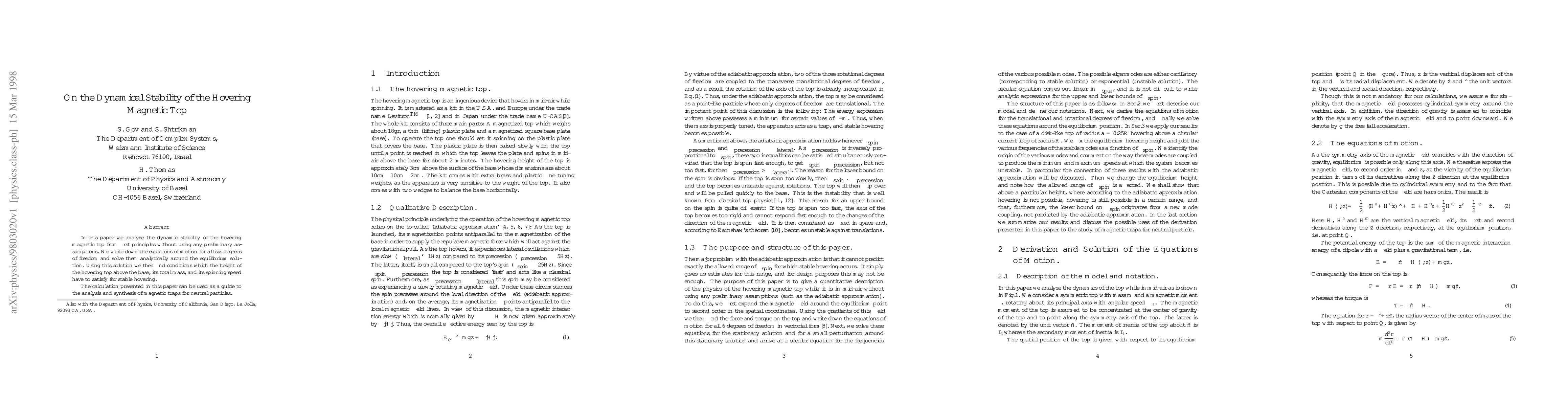 In this paper we analyze the dynamic stability of the hovering magnetic top from first principles without using any preliminary assumptions. We write down the equations of motion for all six degrees of freedom and solve them analytically around the equilibrium solution. Using this solution we then find conditions which the height of the hovering top above the base, its total mass, and its spinning speed have to satisfy for stable hovering. The calculation presented in this paper can be used as a guide to the analysis and synthesis of magnetic traps for neutral particles.
