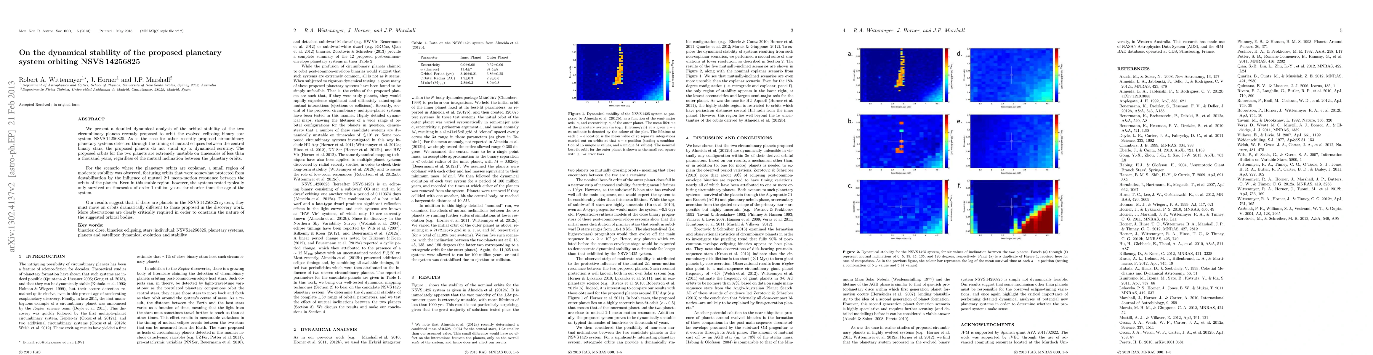This paper analyzes the dynamical stability of two proposed circumbinary planets orbiting NSVS 14256825, finding that their orbits are highly unstable on short timescales. Even in a coplanar configuration with a 2:1 mean-motion resonance, the systems only exhibit moderate stability for about 1 million years. The findings suggest the need for new observations to confirm the existence and nature of any potential planets in this system.