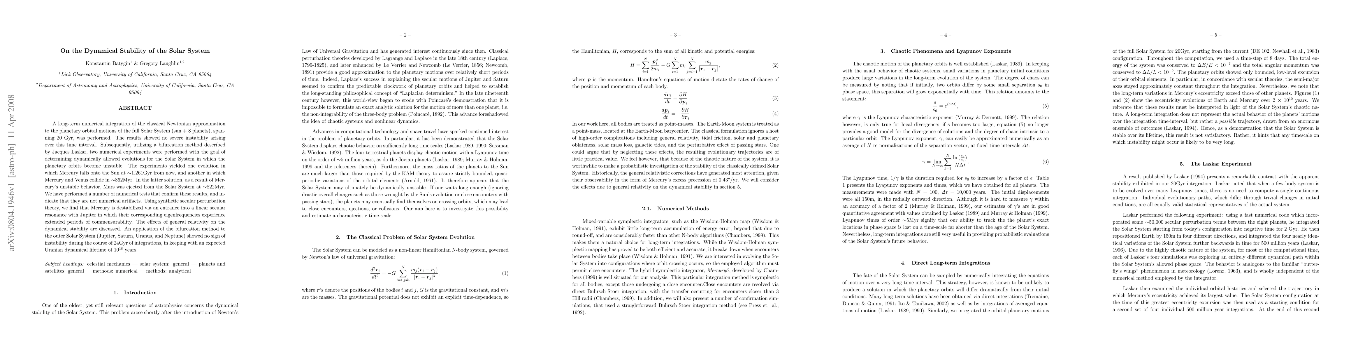 This paper investigates the long-term dynamical stability of the Solar System over 20 Gyr using numerical integration and bifurcation methods. The study finds no severe instability but identifies two scenarios where Mercury falls onto the Sun or collides with Venus, leading to Mars' ejection. The destabilization of Mercury is attributed to a resonance with Jupiter.