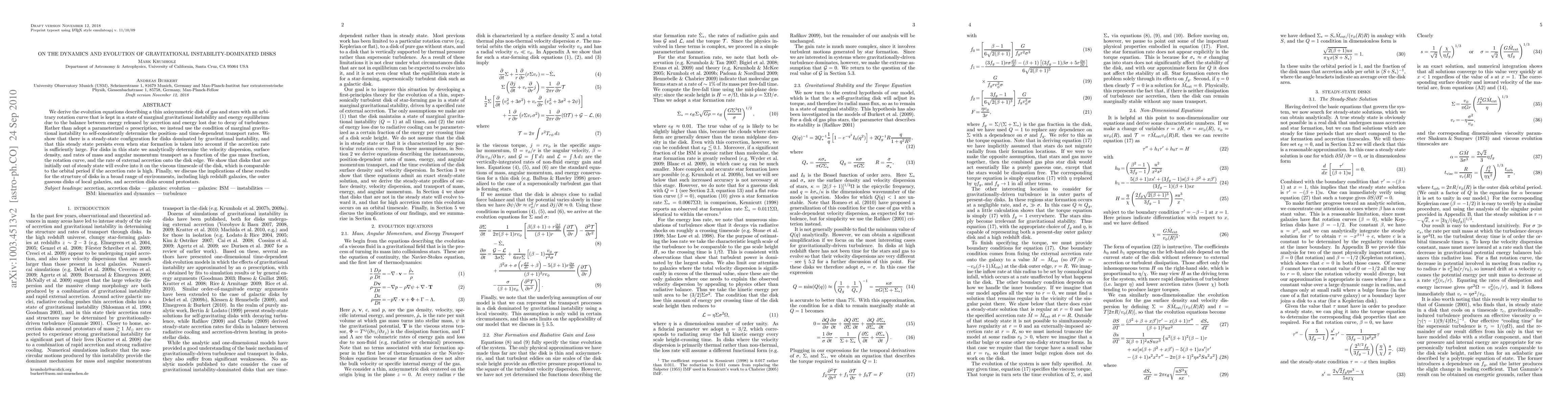 This paper derives evolution equations for gravitationally unstable disks in marginal instability, determining self-consistent transport rates and showing steady-state configurations persist with high accretion rates. It discusses the implications for various disk environments, including high redshift galaxies and protostellar accretion disks.