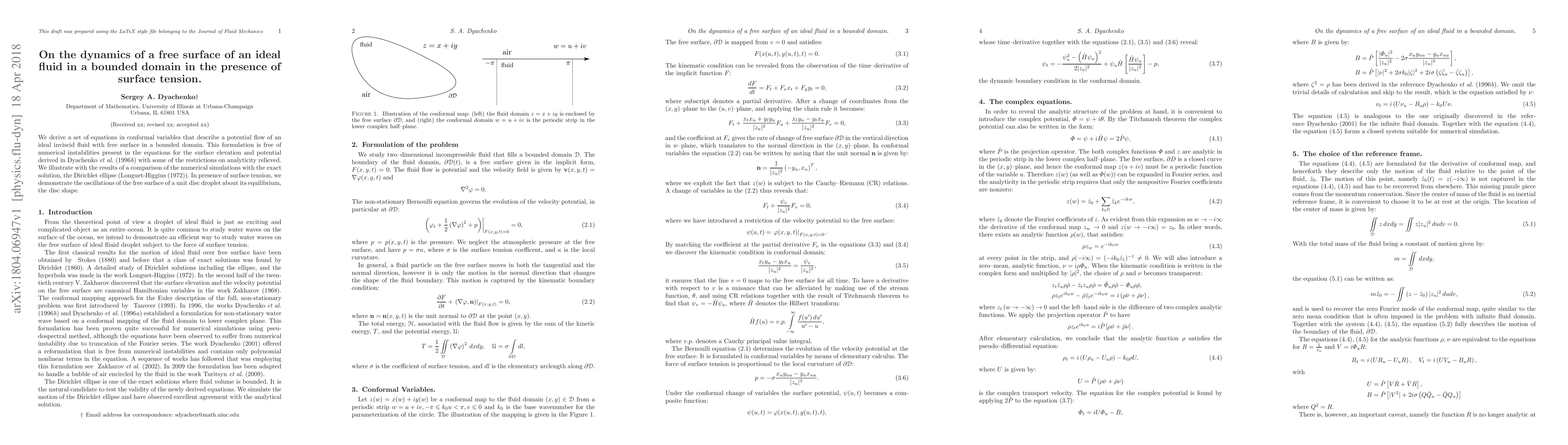 This paper derives a new set of equations in conformal variables for potential flow of an ideal fluid with free surface, addressing numerical instabilities and relaxing analyticity restrictions. Numerical simulations confirm the method's accuracy using the Dirichlet ellipse as an exact solution, and demonstrate surface tension-induced oscillations in a unit disc droplet.