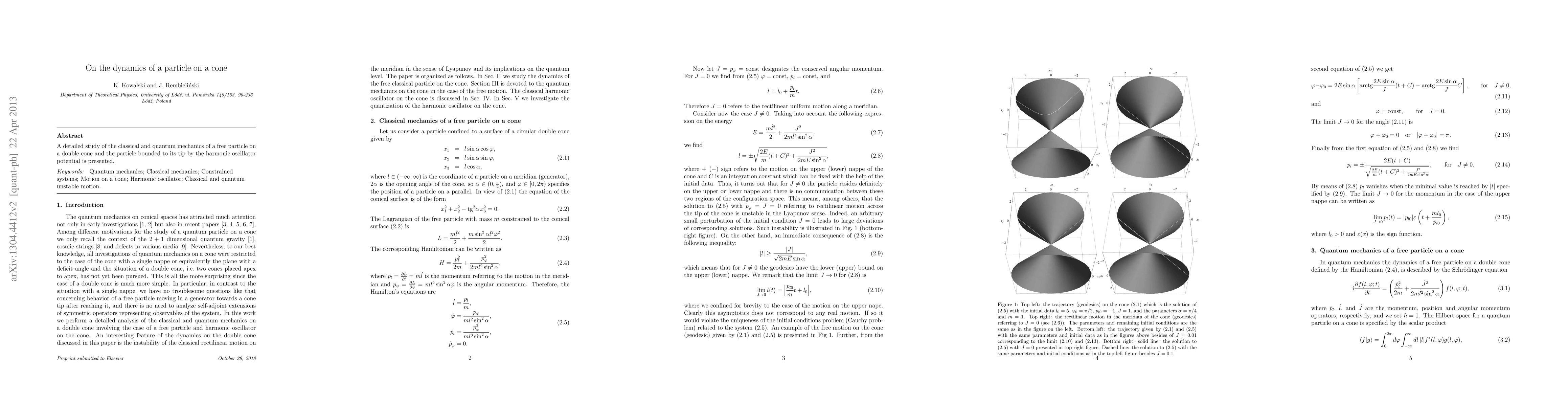 This paper studies the behavior of a particle on a cone in both classical and quantum mechanics, exploring its dynamics and potential bound by a harmonic oscillator.