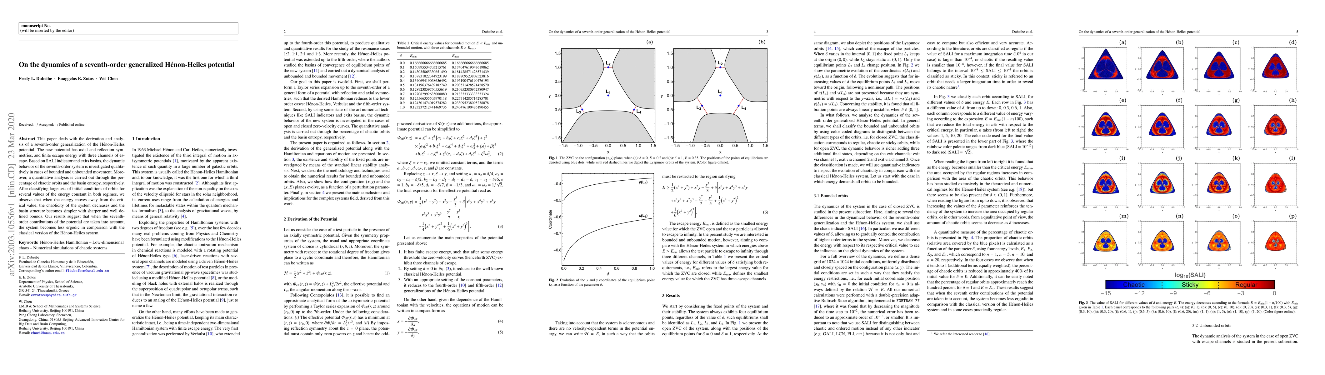 This paper investigates the dynamics of a seventh-order generalized H\'enon-Heiles potential, revealing its axial and reflection symmetries and three escape channels. The study finds that the system's chaoticity decreases and its basin structure simplifies as energy moves away from the critical value, indicating reduced ergodicity compared to the classical H\'enon-Heiles system.