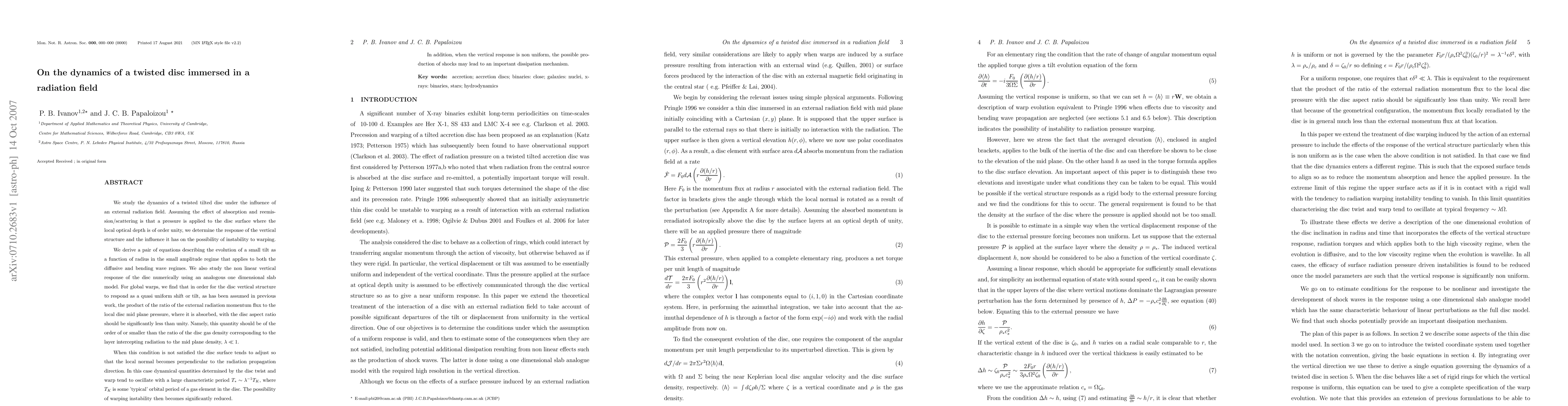 We study the dynamics of a twisted tilted disc under the influence of an external radiation field. Assuming the effect of absorption and reemission/scattering is that a pressure is applied to the disc surface where the local optical depth is of order unity, we determine the response of the vertical structure and the influence it has on the possibility of instability to warping. We derive a pair of equations describing the evolution of a small tilt as a function of radius in the small amplitude regime that applies to both the diffusive and bending wave regimes. We also study the non linear vertical response of the disc numerically using an analogous one dimensional slab model. For global warps, we find that in order for the disc vertical structure to respond as a quasi uniform shift or tilt, as has been assumed in previous work, the product of the ratio of the external radiation momentum flux to the local disc mid plane pressure, where it is absorbed, with the disc aspect ratio should be significantly less than unity. Namely, this quantity should be of the order of or smaller than the ratio of the disc gas density corresponding to the layer intercepting radiation to the mid plane density, $\lambda \ll 1$. When this condition is not satisfied the disc surface tends to adjust so that the local normal becomes perpendicular to the radiation propagation direction. In this case dynamical quantities determined by the disc twist and warp tend to oscillate with a large characteristic period $T_{*}\sim \lambda^{-1}T_{K}$, where $T_{K}$ is some 'typical' orbital period of a gas element in the disc. The possibility of warping instability then becomes significantly reduced. In addition, when the vertical response is non uniform, the possible production of shocks may lead to an important dissipation mechanism.