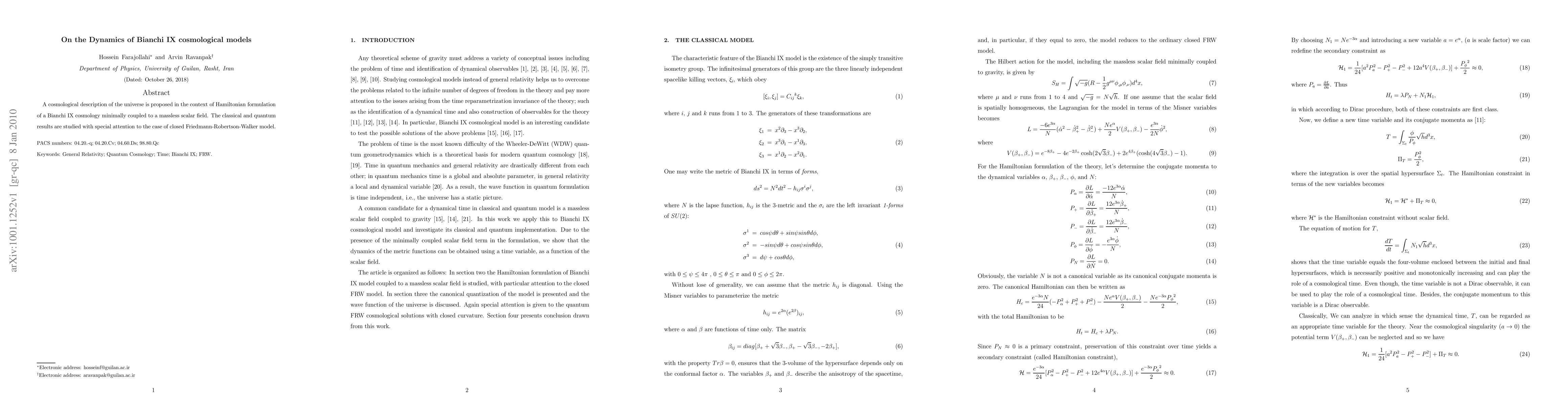 This paper explores the dynamics of Bianchi IX cosmological models using a Hamiltonian formulation, focusing on classical and quantum aspects, particularly in the context of a closed Friedmann-Robertson-Walker model coupled with a massless scalar field. The study aims to provide insights into the universe's evolution under these conditions.