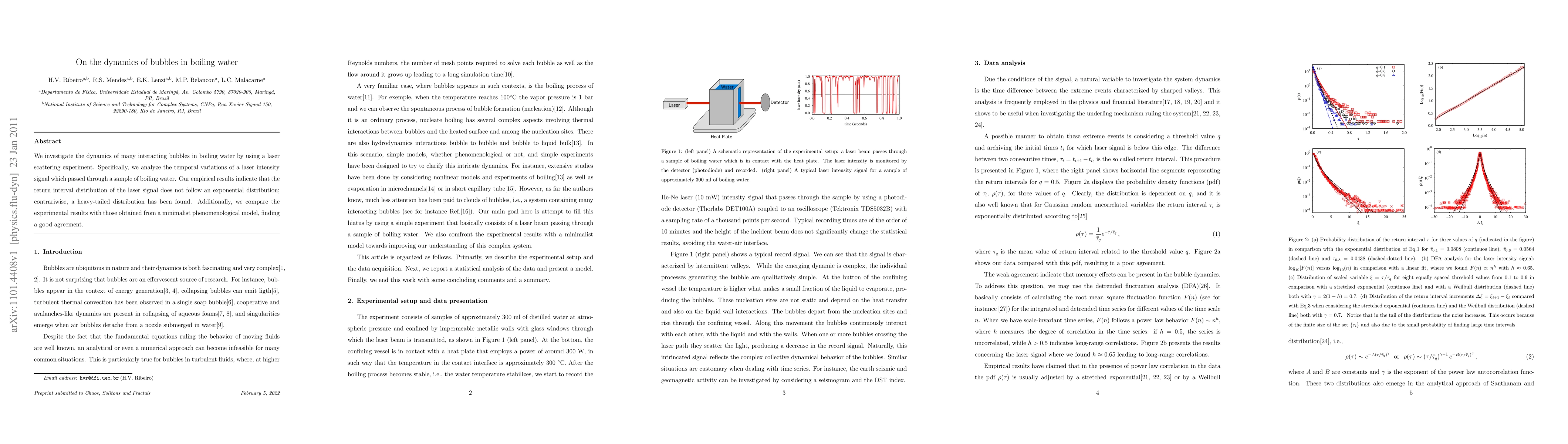 We investigate the dynamics of many interacting bubbles in boiling water by using a laser scattering experiment. Specifically, we analyze the temporal variations of a laser intensity signal which passed through a sample of boiling water. Our empirical results indicate that the return interval distribution of the laser signal does not follow an exponential distribution; contrariwise, a heavy-tailed distribution has been found. Additionally, we compare the experimental results with those obtained from a minimalist phenomenological model, finding a good agreement.