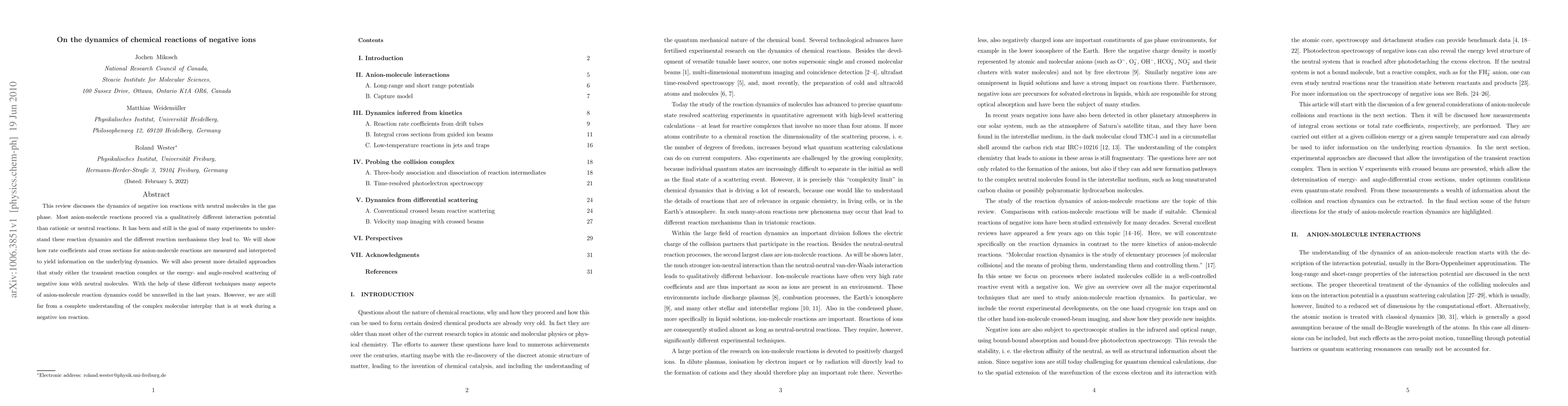 This review discusses the dynamics of negative ion reactions with neutral molecules in the gas phase. Most anion-molecule reactions proceed via a qualitatively different interaction potential than cationic or neutral reactions. It has been and still is the goal of many experiments to understand these reaction dynamics and the different reaction mechanisms they lead to. We will show how rate coefficients and cross sections for anion-molecule reactions are measured and interpreted to yield information on the underlying dynamics. We will also present more detailed approaches that study either the transient reaction complex or the energy- and angle-resolved scattering of negative ions with neutral molecules. With the help of these different techniques many aspects of anion-molecule reaction dynamics could be unravelled in the last years. However, we are still far from a complete understanding of the complex molecular interplay that is at work during a negative ion reaction.