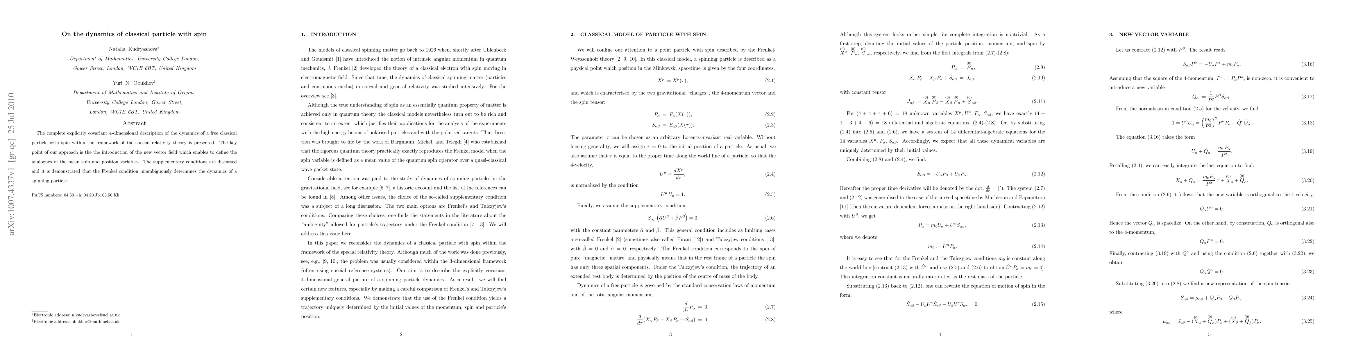 The complete explicitly covariant 4-dimensional description of the dynamics of a free classical particle with spin within the framework of the special relativity theory is presented. The key point of our approach is the the introduction of the new vector field which enables to define the analogues of the mean spin and position variables. The supplementary conditions are discussed and it is demonstrated that the Frenkel condition unambiguously determines the dynamics of a spinning particle.