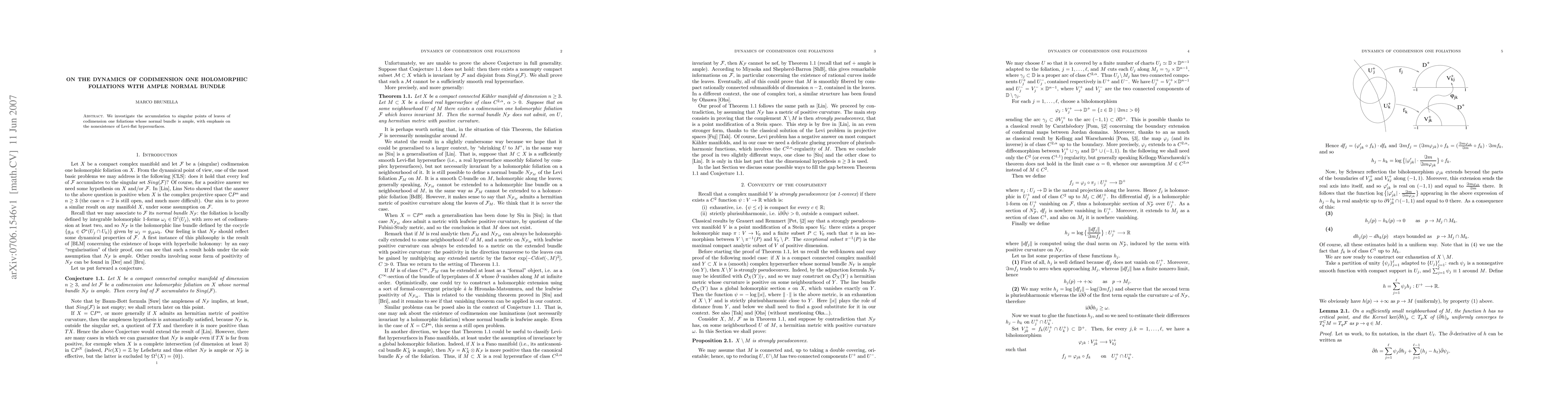 Summary: This paper explores the dynamics of codimension one holomorphic foliations with ample normal bundles, focusing on the absence of Levi-flat hypersurfaces near singular points. The study emphasizes the accumulation behavior of leaves around these singularities.