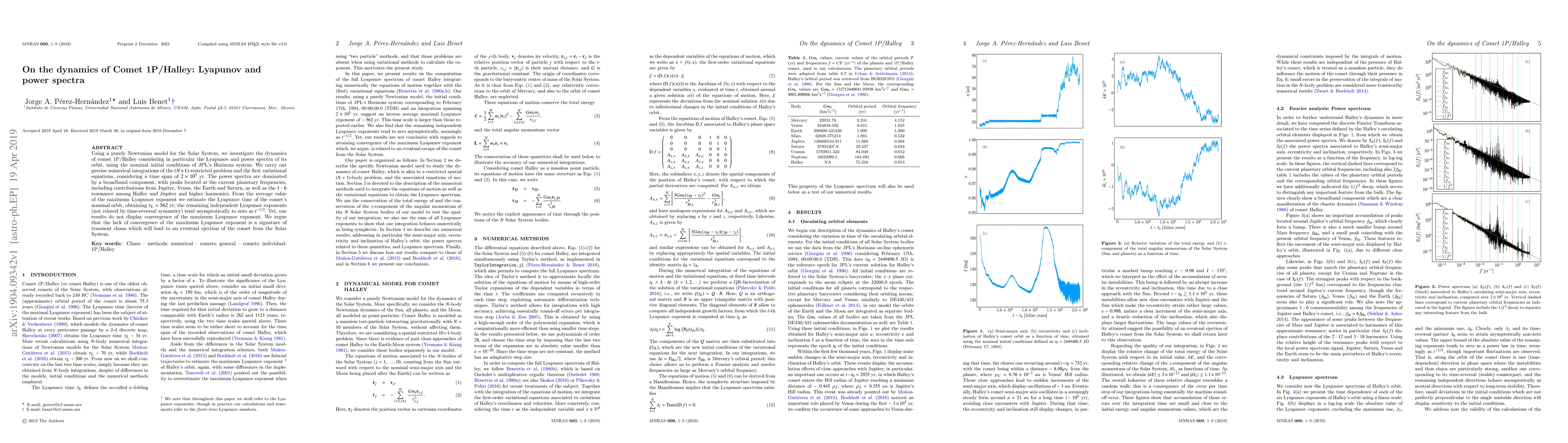 This paper explores the dynamics of Comet 1P/Halley using Newtonian models, focusing on its Lyapunov and power spectra over a 200,000-year span. The study finds transient chaos indicated by the lack of convergence in the maximum Lyapunov exponent, suggesting eventual ejection from the Solar System.