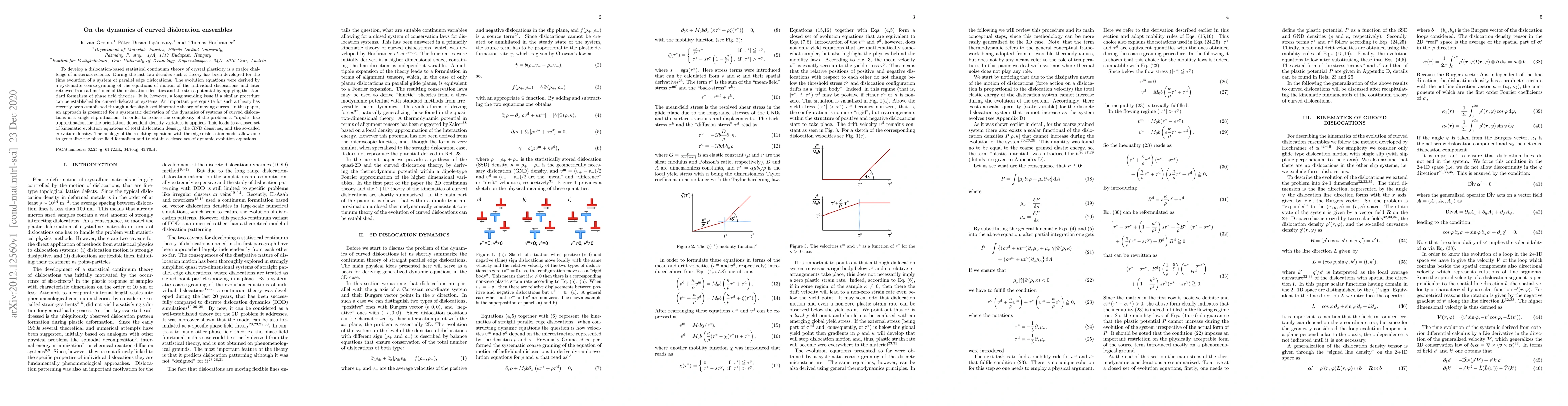 This paper develops a dislocation-based statistical continuum theory for the dynamics of curved dislocation ensembles in single slip situations, employing a dipole approximation to derive a closed set of kinematic evolution equations for total dislocation, geometrically necessary dislocation, and curvature densities. The approach generalizes the phase field formalism for edge dislocations to curved dislocation systems.