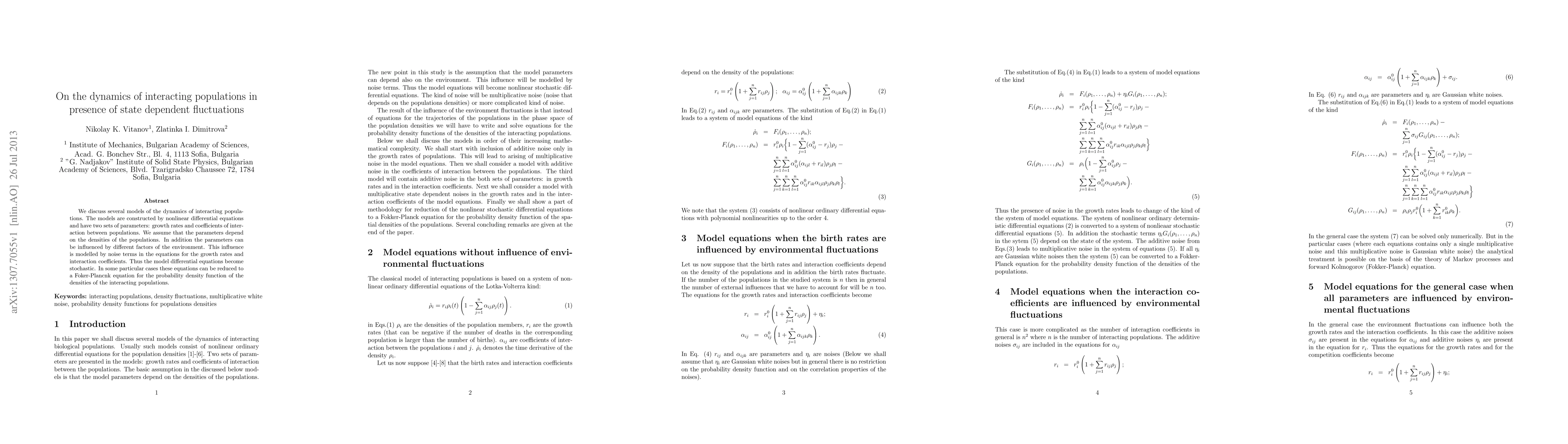 We discuss several models of the dynamics of interacting populations. The models are constructed by nonlinear differential equations and have two sets of parameters: growth rates and coefficients of interaction between populations. We assume that the parameters depend on the densities of the populations. In addition the parameters can be influenced by different factors of the environment. This influence is modelled by noise terms in the equations for the growth rates and interaction coefficients. Thus the model differential equations become stochastic. In some particular cases these equations can be reduced to a Foker-Plancnk equation for the probability density function of the densities of the interacting populations.
