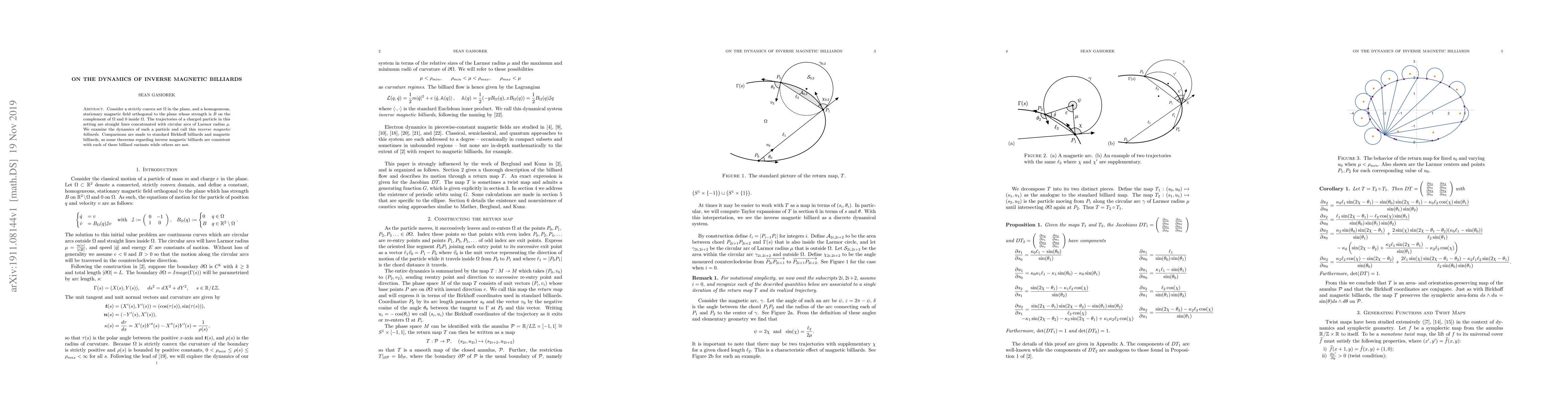 This paper investigates the dynamics of inverse magnetic billiards, where a charged particle moves in a strictly convex set with a magnetic field outside but not inside. The study compares these dynamics to standard Birkhoff and magnetic billiards, revealing both consistent and divergent theorems.