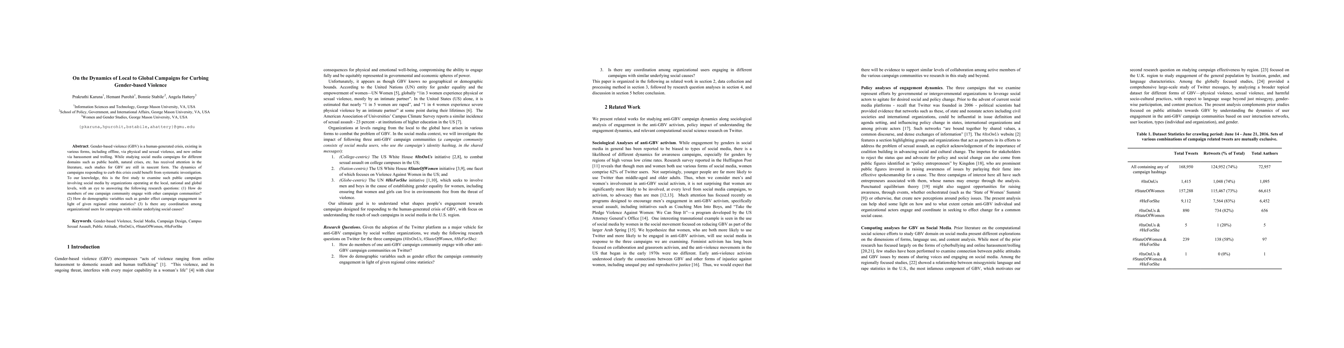 Gender-based violence (GBV) is a human-generated crisis, existing in various forms, including offline, via physical and sexual violence, and now online via harassment and trolling. While studying social media campaigns for different domains such as public health, natural crises, etc. has received attention in the literature, such studies for GBV are still in nascent form. The dynamics of campaigns responding to curb this crisis could benefit from systematic investigation. To our knowledge, this is the first study to examine such public campaigns involving social media by organizations operating at the local, national and global levels, with an eye to answering the following research questions: (1) How do members of one campaign community engage with other campaign communities? (2) How do demographic variables such as gender effect campaign engagement in light of given regional crime statistics? (3) Is there any coordination among organizational users for campaigns with similar underlying social causes?