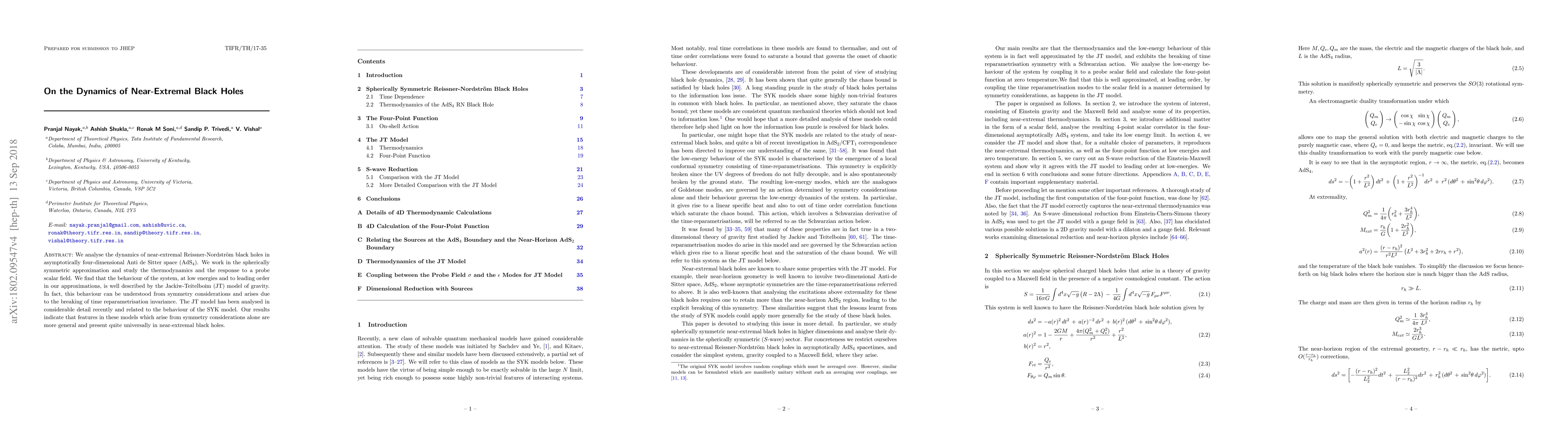 We analyse the dynamics of near-extremal Reissner-Nordstr\"om black holes in asymptotically four-dimensional Anti-de Sitter space (AdS$_4$). We work in the spherically symmetric approximation and study the thermodynamics and the response to a probe scalar field. We find that the behaviour of the system, at low energies and to leading order in our approximations, is well described by the Jackiw-Teitelboim (JT) model of gravity. In fact, this behaviour can be understood from symmetry considerations and arises due to the breaking of time reparametrisation invariance. The JT model has been analysed in considerable detail recently and related to the behaviour of the SYK model. Our results indicate that features in these models which arise from symmetry considerations alone are more general and present quite universally in near-extremal black holes.