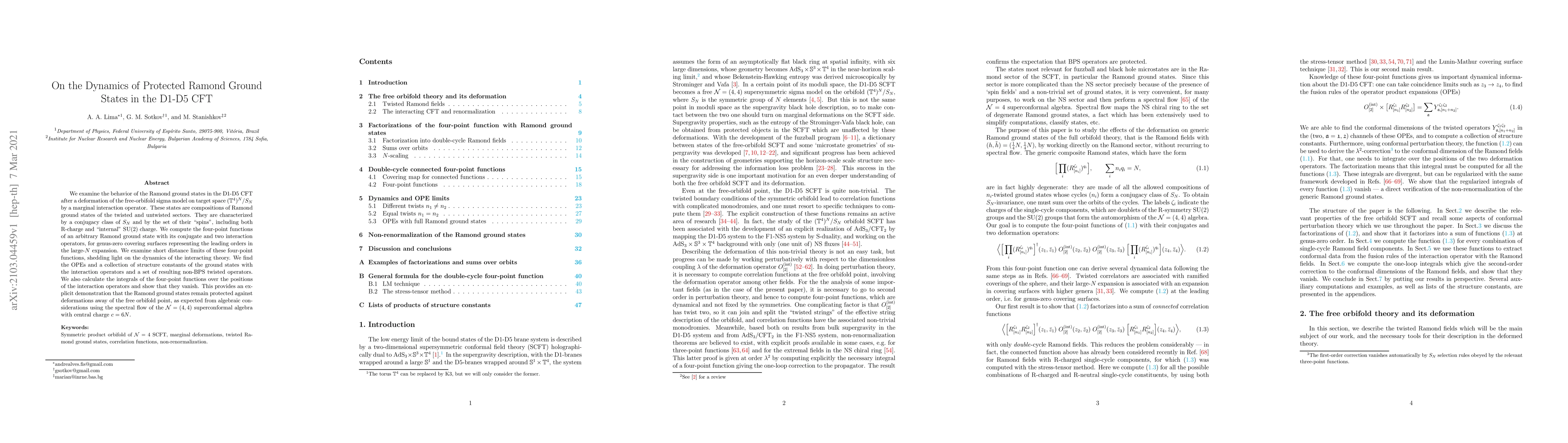 This paper investigates the dynamics of protected Ramond ground states in the D1-D5 conformal field theory (CFT) after a deformation by a marginal interaction operator. It finds that the Ramond ground states remain protected against such deformations, as demonstrated by the vanishing integrals of four-point functions and the computation of operator product expansions (OPEs).