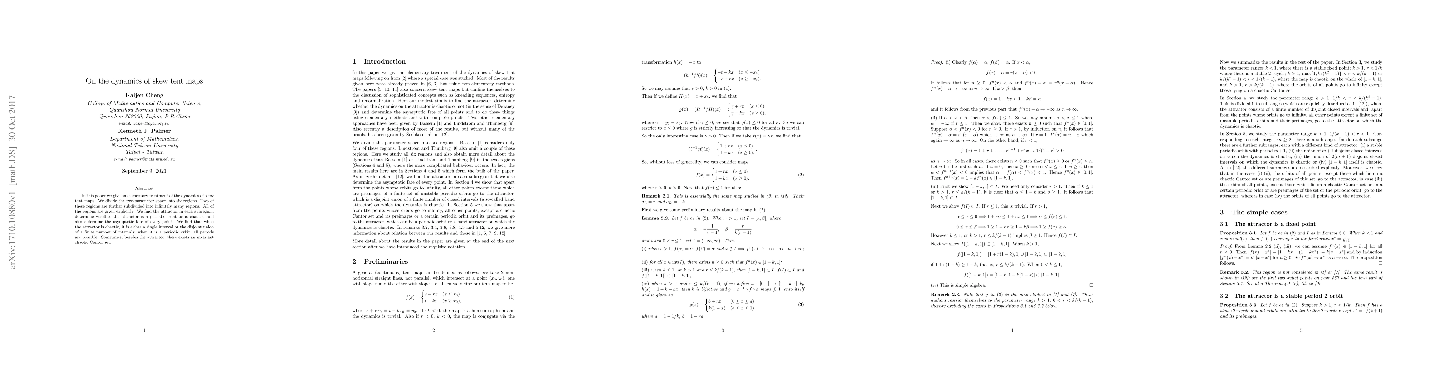 This paper provides an elementary analysis of skew tent map dynamics, dividing the two-parameter space into six regions and determining the attractor type for each. It finds that chaotic attractors can be either single or multiple intervals, while periodic orbits allow all possible periods, sometimes accompanied by invariant chaotic Cantor sets.