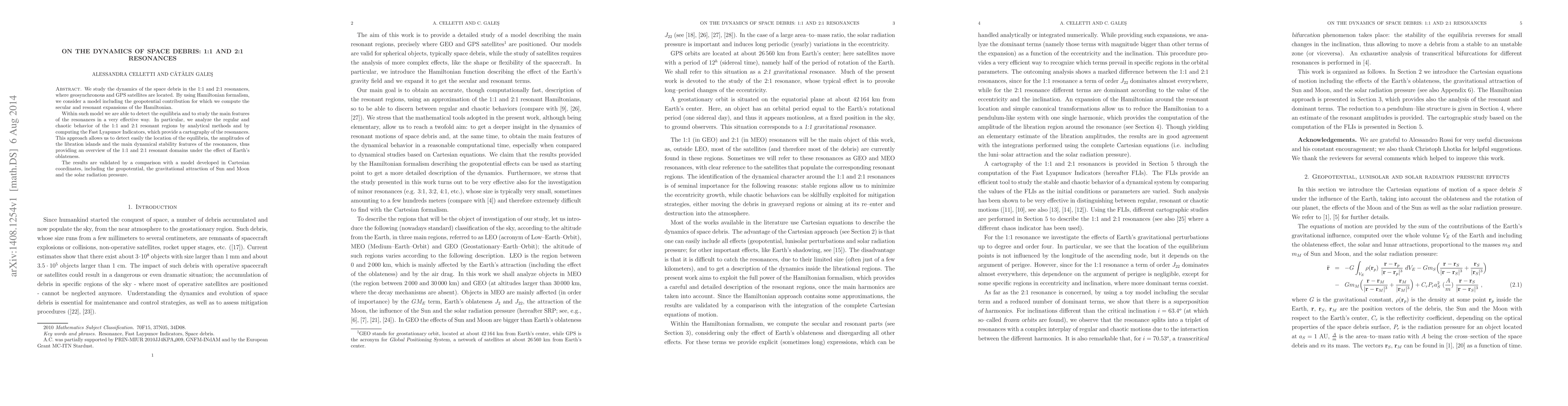 This study uses Hamiltonian formalism to analyze the dynamics of space debris in 1:1 and 2:1 resonances, crucial for geosynchronous and GPS satellites. It identifies equilibria, libration islands, and stability features via secular and resonant expansions, and Fast Lyapunov Indicators, validating findings with a Cartesian coordinate model incorporating Earth's oblateness, solar and lunar gravitational effects, and solar radiation pressure.