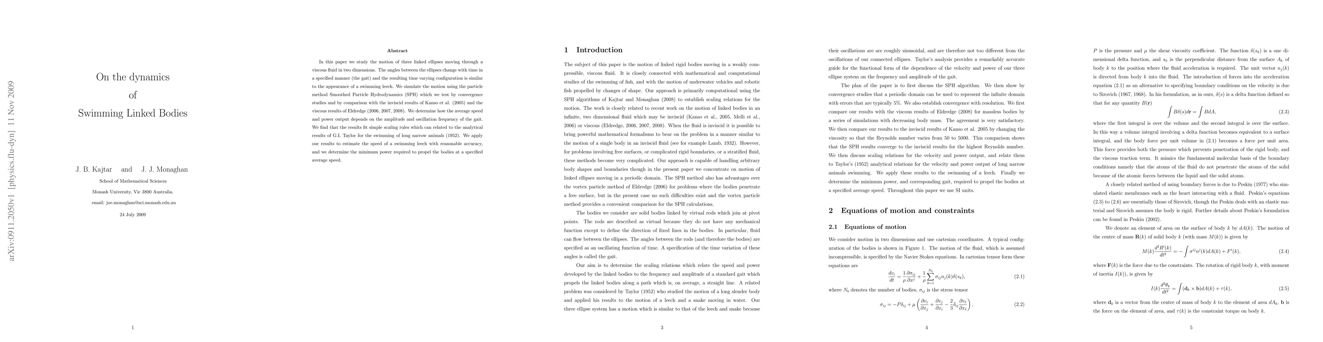 Researchers studied the motion of three linked ellipses in water using a simulation method, finding that average speed and power output depend on gait parameters, with results fitting simple scaling rules similar to earlier analytical work by Taylor for swimming animals.