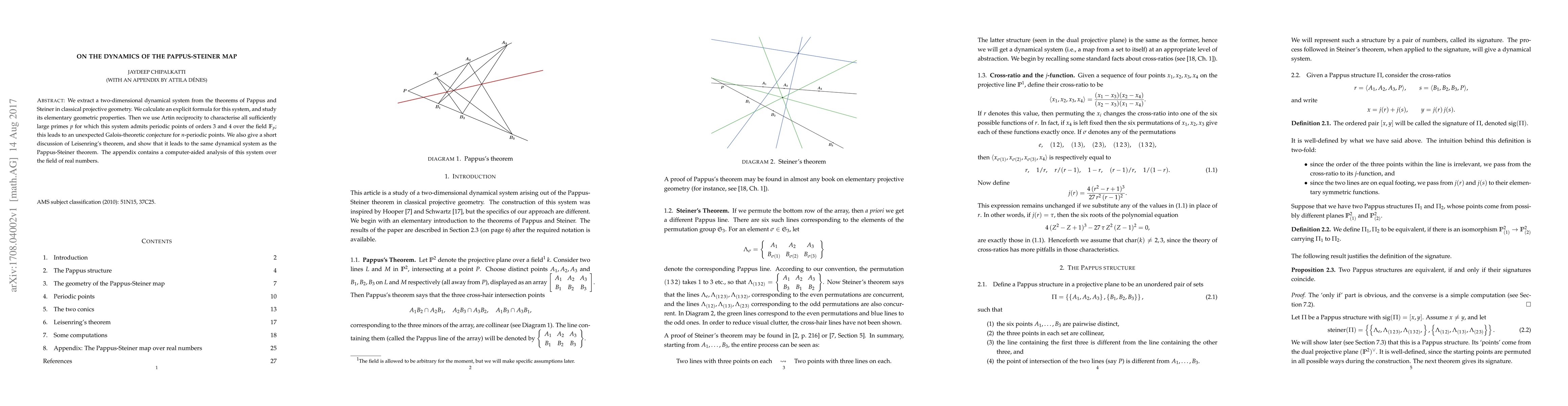 We extract a two-dimensional dynamical system from the theorems of Pappus and Steiner in classical projective geometry. We calculate an explicit formula for this system, and study its elementary geometric properties. Then we use Artin reciprocity to characterise all sufficiently large primes $p$ for which this system admits periodic points of orders $3$ and $4$ over the field ${\mathbb F}_p$; this leads to an unexpected Galois-theoretic conjecture for $n$-periodic points. We also give a short discussion of Leisenring's theorem, and show that it leads to the same dynamical system as the Pappus-Steiner theorem. The appendix contains a computer-aided analysis of this system over the field of real numbers.