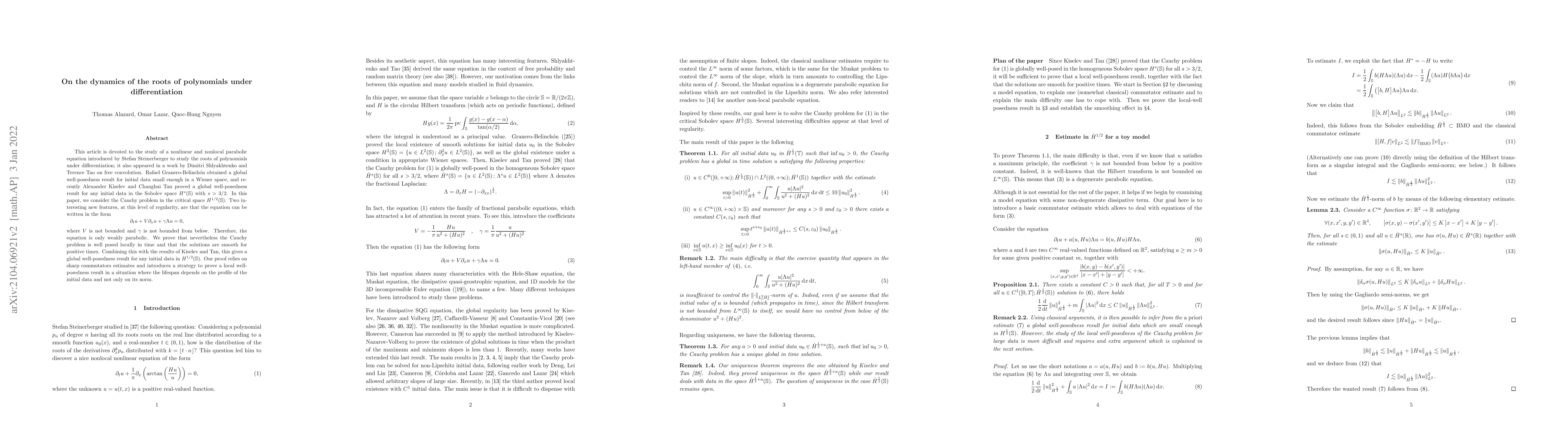 This paper investigates the dynamics of polynomial roots under differentiation through a nonlinear parabolic equation, proving local well-posedness in the critical space $H^{1/2}(\mathbb{S})$ and establishing global well-posedness for any positive initial data. The equation's unique features lead to a weakly parabolic form, but solutions remain smooth for positive times.