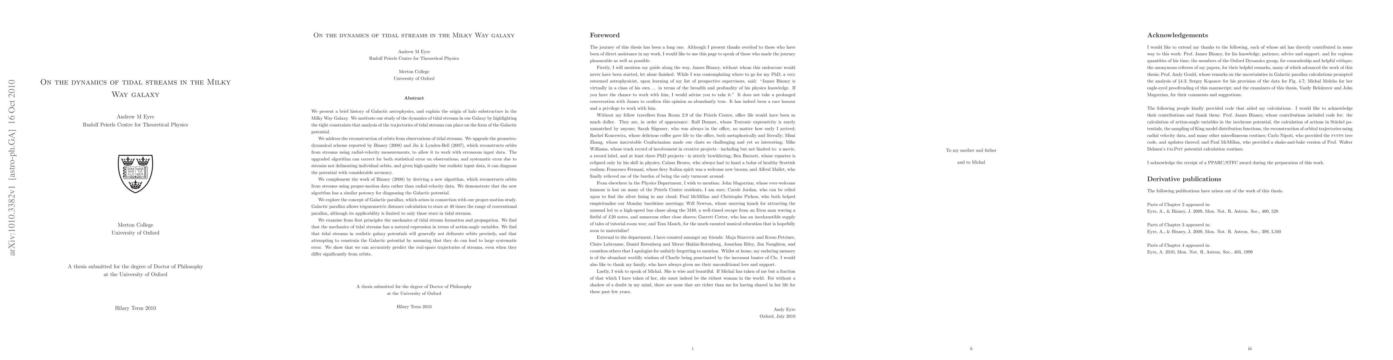 We present a brief history of Galactic astrophysics, and explain the origin of halo substructure in the Galaxy. We motivate our study of tidal streams by highlighting the tight constraints that analysis of the trajectories of tidal streams can place on the form of the Galactic potential. We address the reconstruction of orbits from observations of tidal streams. We upgrade the scheme reported by Binney (2008) and Jin & Lynden-Bell (2007), which reconstructs orbits from streams using radial-velocity measurements, to allow it to work with erroneous input data. The upgraded algorithm can correct for both statistical error on observations, and systematic error due to streams not delineating individual orbits, and given high-quality but realistic input data, it can diagnose the potential with considerable accuracy. We complement the work of Binney (2008) by deriving a new algorithm, which reconstructs orbits from streams using proper-motion data rather than radial velocities. We show that the new algorithm has a similar potency for diagnosing the Galactic potential. We explore the concept of Galactic parallax, which arises in connection with our proper-motion study. Galactic parallax allows trigonometric distance calculation to stars at 40 times the range of conventional parallax, although its applicability is limited to only those stars in tidal streams. We examine from first principles the mechanics of tidal stream formation and propagation. We find that the mechanics of tidal streams has a natural expression in terms of action-angle variables. We find that tidal streams in realistic galaxy potentials will generally not delineate orbits, and that attempting to constrain the Galactic potential by assuming that they do can lead to large systematic error. We show that we can accurately predict the real-space trajectories of streams, even when they differ significantly from orbits.