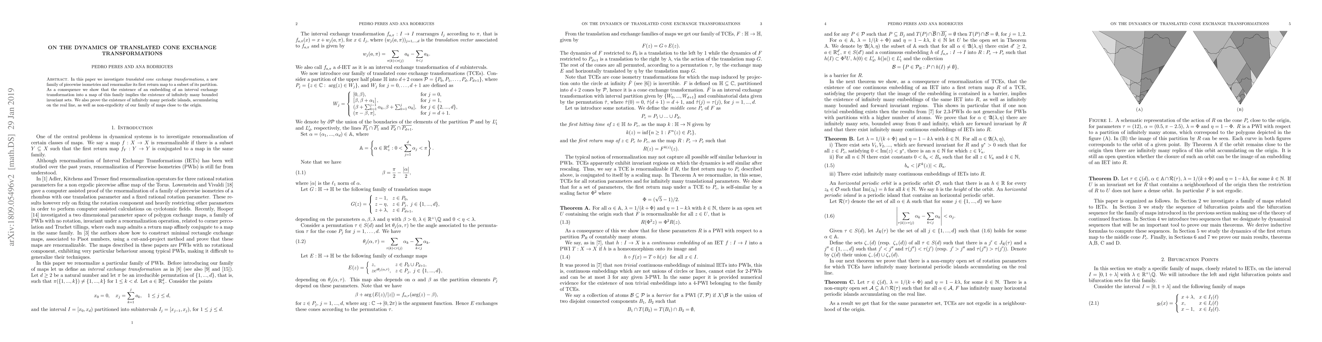 In this paper we investigate translated cone exchange transformations, a new family of piecewise isometries and renormalize its first return map to a subset of its partition. As a consequence we show that the existence of an embedding of an interval exchange transformation into a map of this family implies the existence of infinitely many bounded invariant sets. We also prove the existence of infinitely many periodic islands, accumulating on the real line, as well as non-ergodicity of our family of maps close to the origin.