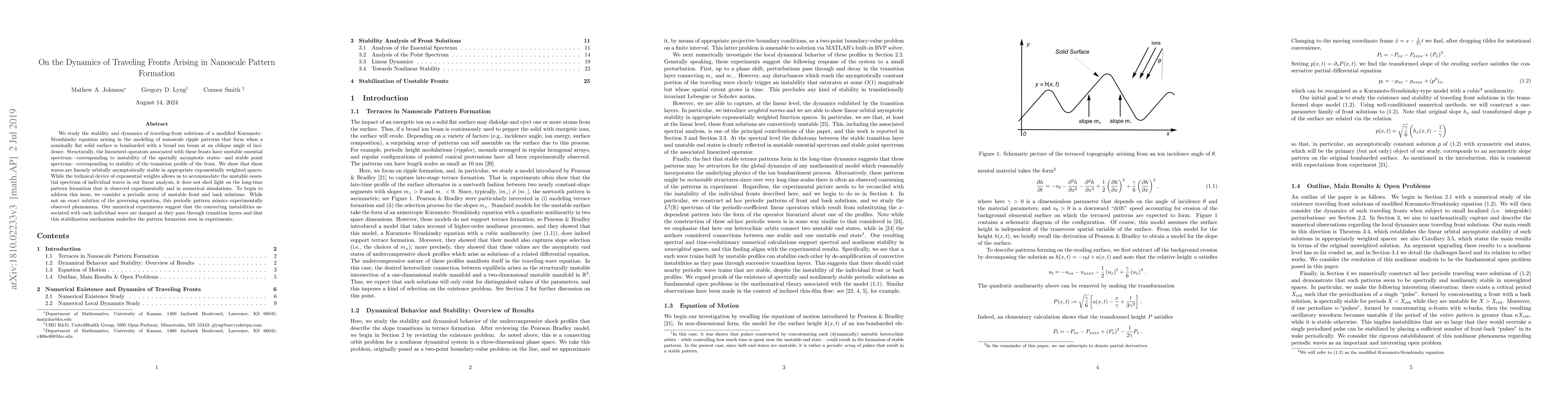 This research investigates traveling front dynamics in nanoscale pattern formation, finding that while individual waves are linearly stable in weighted spaces, their convecting instabilities are damped through transition layers, suggesting a stabilization mechanism for observed pattern formation in experiments.