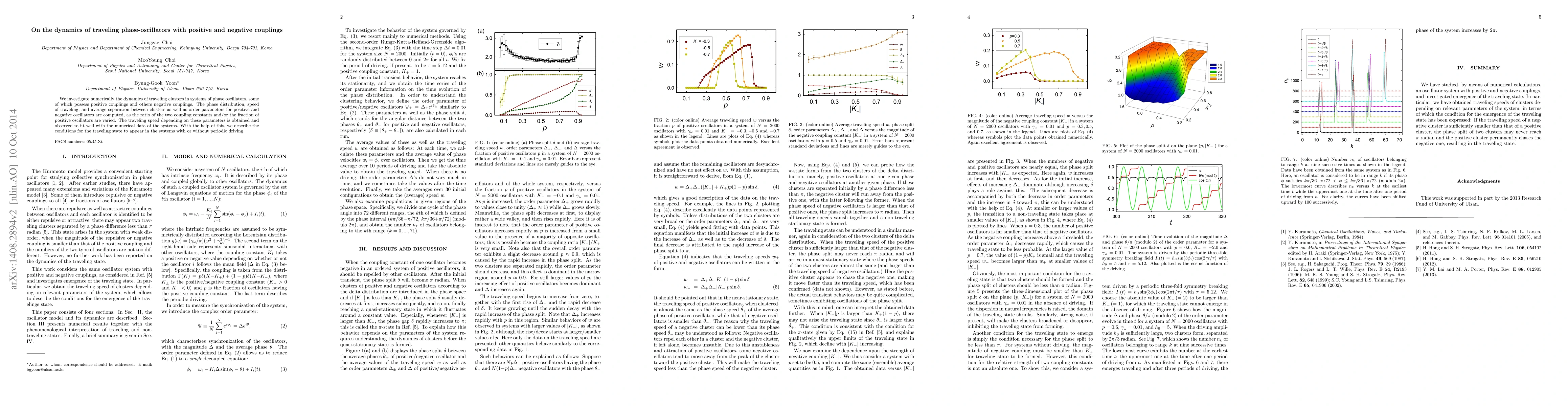 We investigate numerically the dynamics of traveling clusters in systems of phase oscillators, some of which possess positive couplings and others negative couplings. The phase distribution, speed of traveling, and average separation between clusters as well as order parameters for positive and negative oscillators are computed, as the ratio of the two coupling constants and/or the fraction of positive oscillators are varied. The traveling speed depending on these parameters is obtained and observed to fit well with the numerical data of the systems. With the help of this, we describe the conditions for the traveling state to appear in the systems with or without periodic driving.