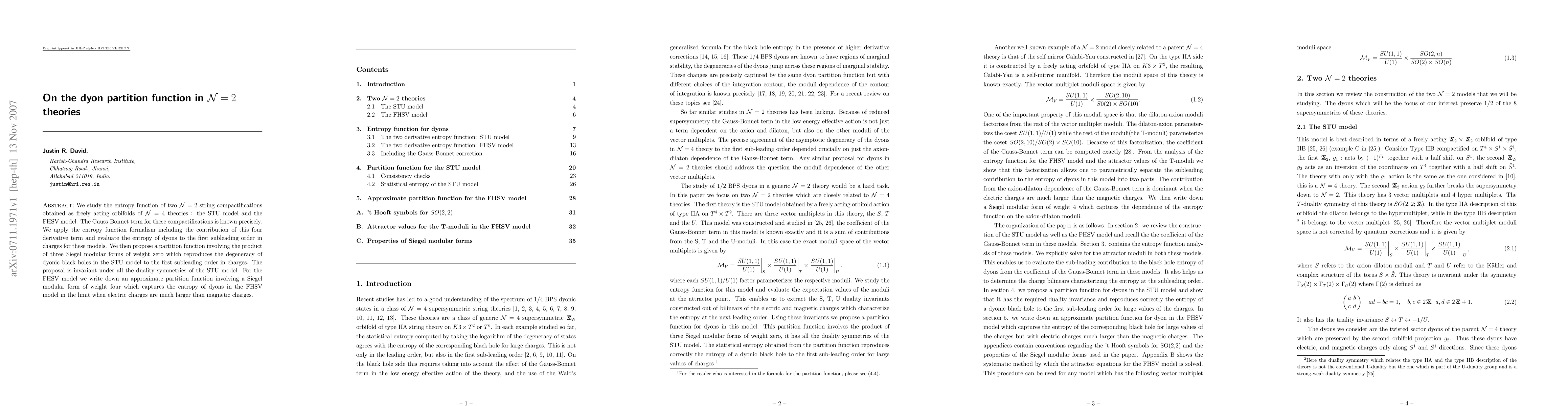 We study the entropy function of two N =2 string compactifications obtained as freely acting orbifolds of N=4 theories : the STU model and the FHSV model. The Gauss-Bonnet term for these compactifications is known precisely. We apply the entropy function formalism including the contribution of this four derivative term and evaluate the entropy of dyons to the first subleading order in charges for these models. We then propose a partition function involving the product of three Siegel modular forms of weight zero which reproduces the degeneracy of dyonic black holes in the STU model to the first subleading order in charges. The proposal is invariant under all the duality symmetries of the STU model. For the FHSV model we write down an approximate partition function involving a Siegel modular form of weight four which captures the entropy of dyons in the FHSV model in the limit when electric charges are much larger than magnetic charges.