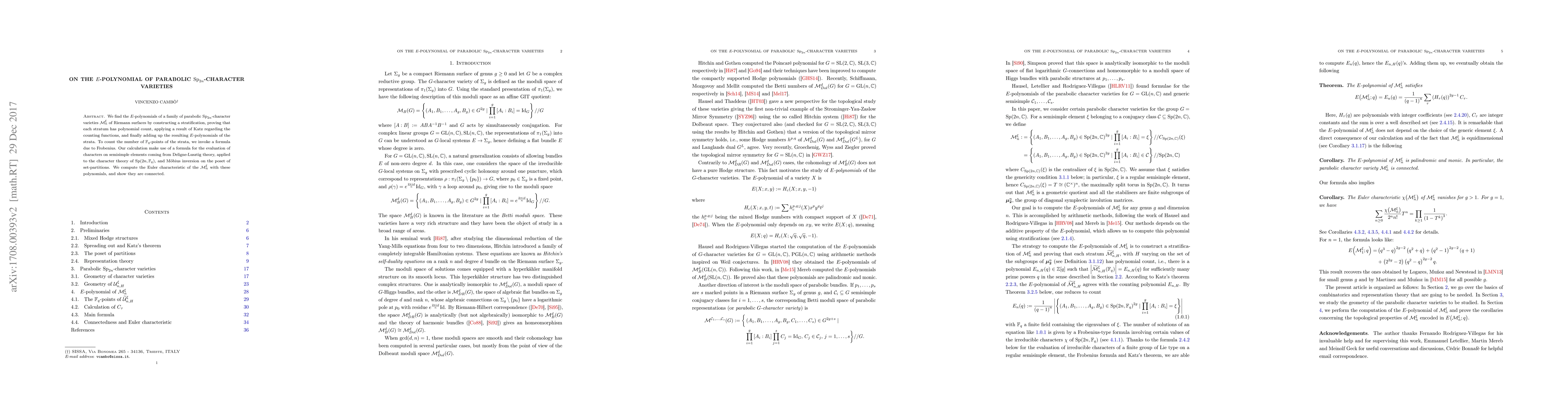 This paper determines the $E$-polynomials for parabolic $\mathrm{Sp}_{2n}$-character varieties $\mathcal{M}^{\xi}_{n}$ using stratification and counting techniques. It leverages Deligne-Lusztig theory and Möbius inversion, computing Euler characteristics to prove connectedness.